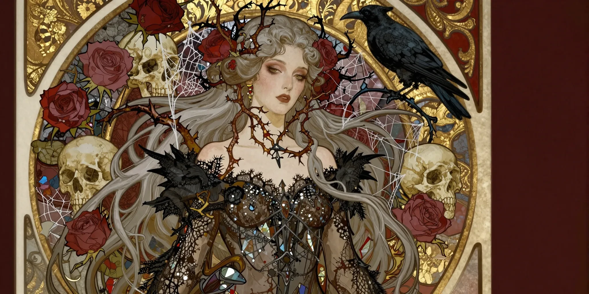 Art Nouveau style illustration, Alphonse Mucha inspired, but with a dark gothic twist. Portrait of a Pale Vampire Queen with long, flowing silver hair that turns into thorny rose vines and spiderwebs. She wears an intricate dress made of black lace and stained glass shards. The background is a decorative circle frame filled with withered roses, skulls, and ravens. Gold leaf accents, sharp outlines, flat colors with intricate line work. Melancholic and elegant atmosphere, deep red and gold and black color scheme. Masterpiece, highly detailed.