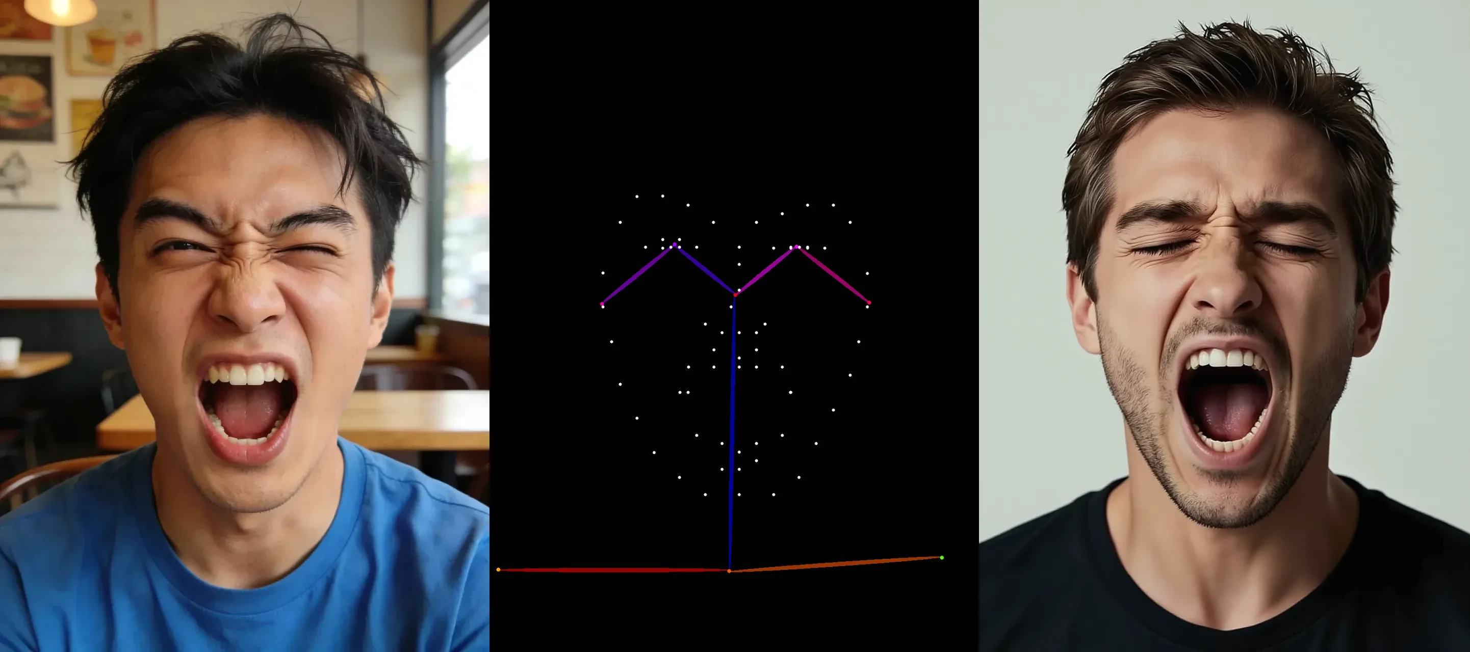 Realism, a Western man, a man shouting with his eyes closed.