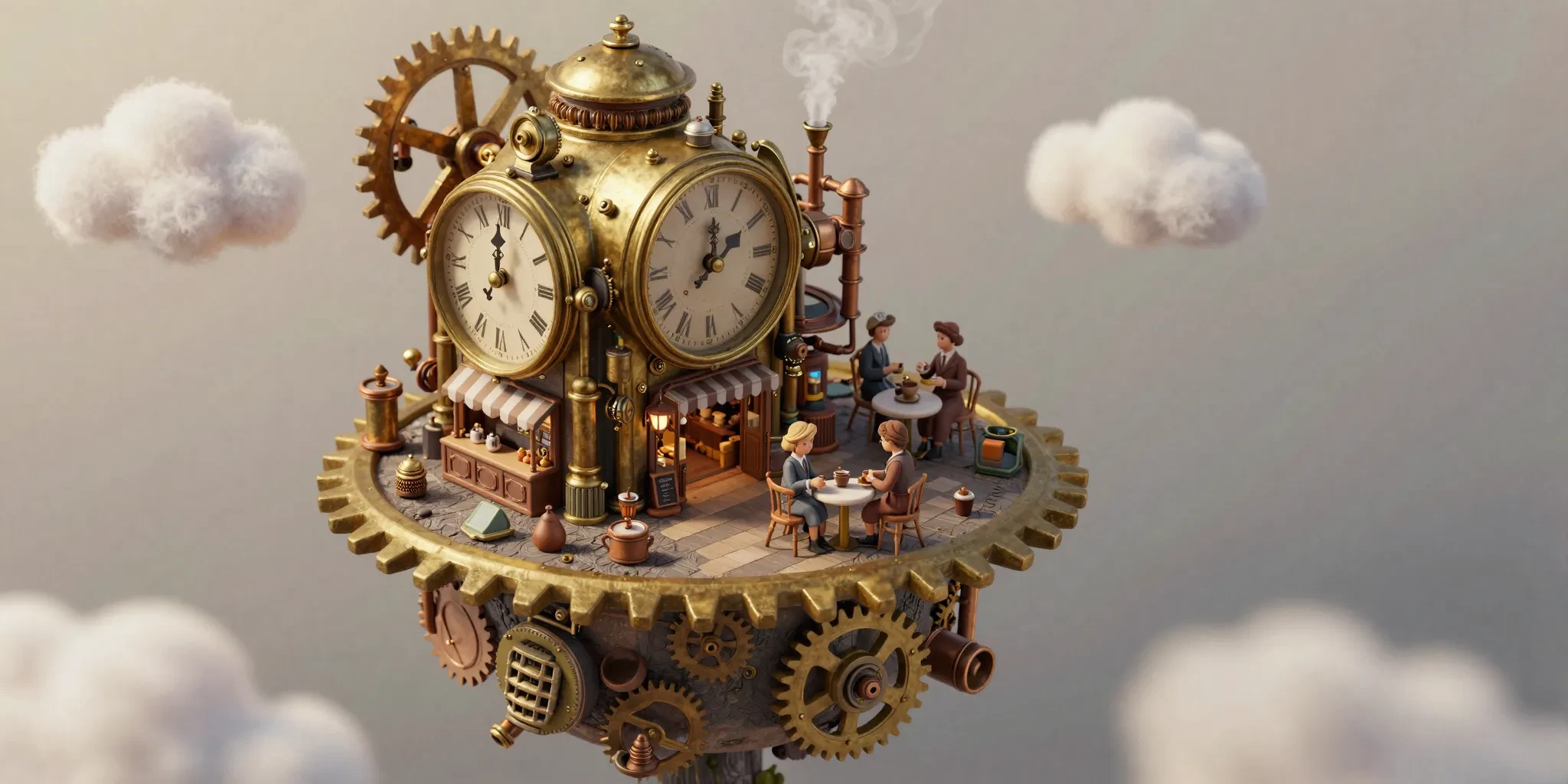 Isometric view, tilt-shift photography style, shallow depth of field. A cute, miniature floating island in the sky. On the island is a tiny, detailed steampunk coffee shop built inside a giant vintage brass clock mechanism. Tiny gears are turning, and steam puffs out of little copper pipes. Miniature people with Victorian clothes are drinking coffee on the gear-shaped terrace. Fluffy clouds surround the island. Soft natural lighting, warm tones, macro lens details, 3D render style, c4d, blender, clay texture, extremely detailed textures.