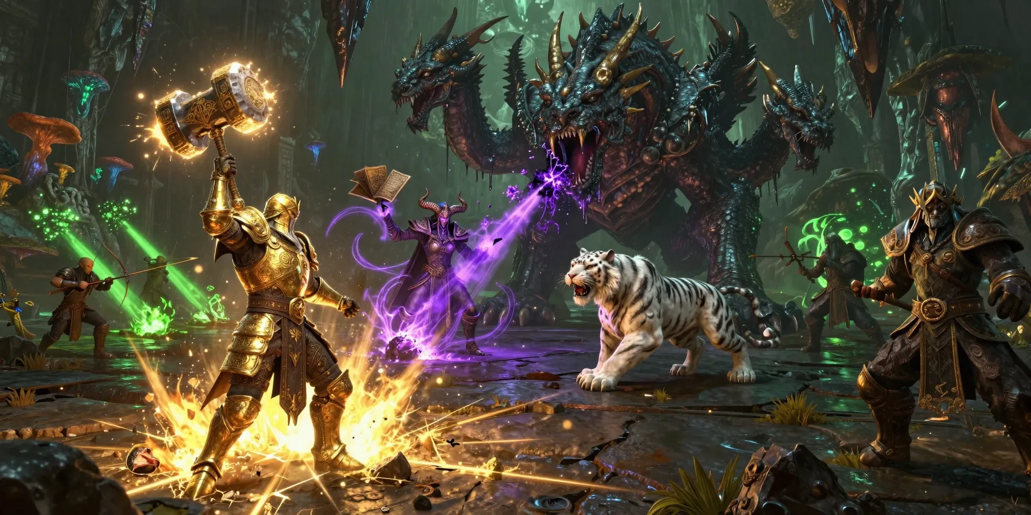 A meticulously detailed 3D MMORPG with a dark fantasy style. The chaotic raid dungeon environment features a gloomy cavern illuminated by bioluminescent fungi and eerie green fel fire. In the foreground, a dwarf paladin in gleaming golden plate armor, engraved with holy scriptures, raises a massive luminous hammer high, smashing down to create a blinding golden consecrated ground effect, cracks of holy light spreading across the dark stone floor. Directly ahead looms a grotesque, multi-headed hydra beast with scaling obsidian skin and dripping acid, roaring as one head recoils from the holy strike, purple venom splattering into the air. In the midground, a tiefling warlock with curved horns and floating grimoires channels a dark purple void beam, chaotic energy tendrils lashing out from her hands. Beside her, a beastmaster hunter commands a spectral white tiger that is pouncing onto the hydra's flank. The background reveals the rest of the raid party: healers casting green rejuvenation beams, archers raining volley shots, and massive stalactites falling from the ceiling due to the tremors. The game boasts a gritty atmosphere, hyper-realistic PBR materials, cinematic volumetric lighting, ray-tracing reflections on armor, 8K resolution, Unreal Engine 5 rendering, extremely detailed monster scales and particle effects, and an intense, boss-fight climax atmosphere.