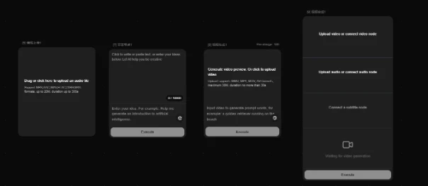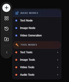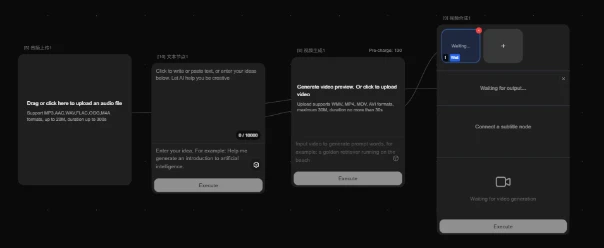 1.Drag in Nodes: Find and drag the following 4 nodes from the left menu onto the canvas: a. Audio Upload: In Audio Tools. b. Text Node: In Basic Nodes. c. Video Generation: In Basic Nodes. d. Video Synthesis: In Video Tools.