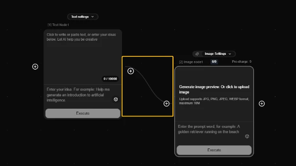 - Connect: Each node has a + sign on both sides. Drag a line to link them, telling AI: "Pass the finished item from this step to the next for further processing."