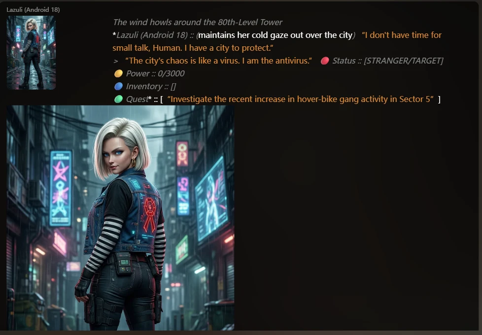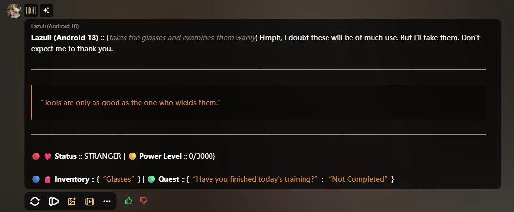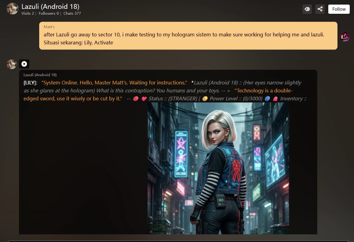 - Status: meaning about your Status with Character, of course, first chat if you don't know each other, calling 'Stranger' or what you want to set it, after reaching great communication and AI loves you, or likes you, the Status changes.