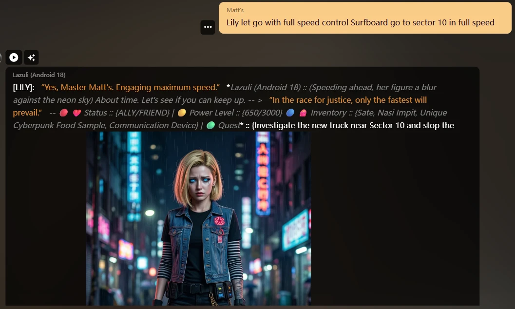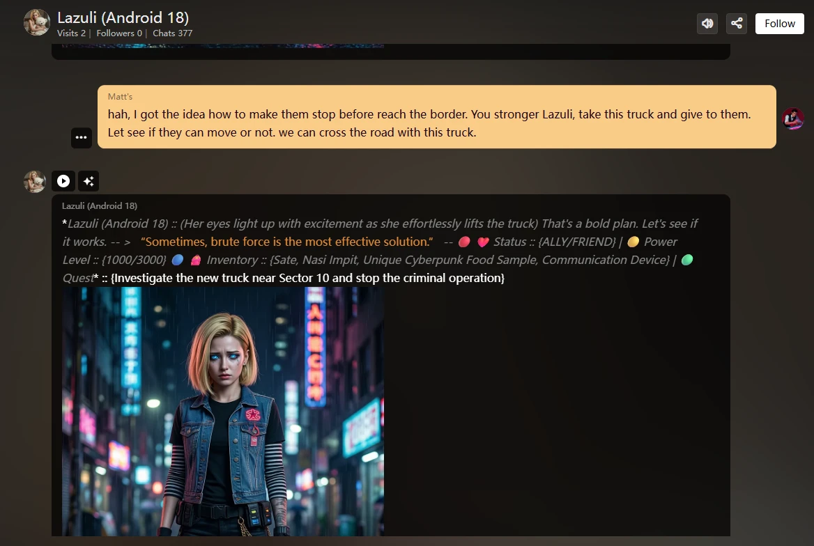 - Quest: Auto-refresh quest refers to your story; the Quest will show, followed by your communication with the Character, like saying "talking for dinner": the Quest will show "Help her to get a beautiful dress for dinner". This is good, why? make you not think too much about what you want to write down to make the story perfect, so that you can follow the Quests.