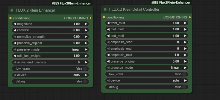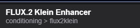 A prompt enhancement node for FLUX.2 Klein. It allows fine adjustment of text and reference image weights, which usually helps improve prompt following and image editing controllability.