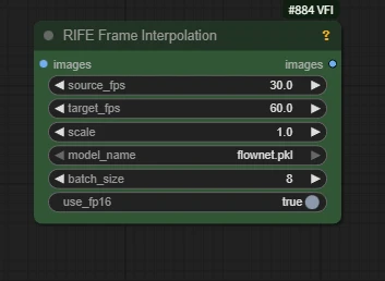 A video frame interpolation node that can generate intermediate frames on demand within workflows, used to improve video frame rate and motion smoothness while balancing speed and effect adjustment.