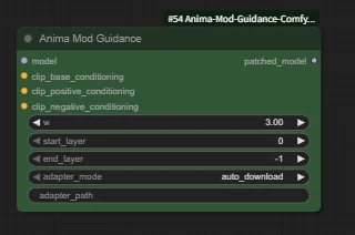 A guidance enhancement node for Anima models. By introducing additional CLIP modulation signals, it usually helps improve prompt adherence and alleviates some color leakage issues.