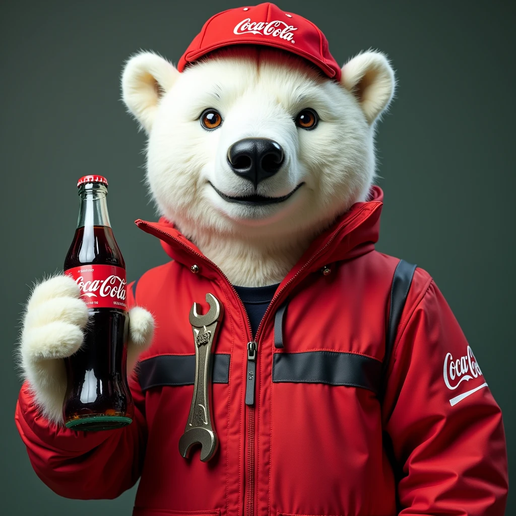 Araffe dressed as a polar bear holding a bottle of coke