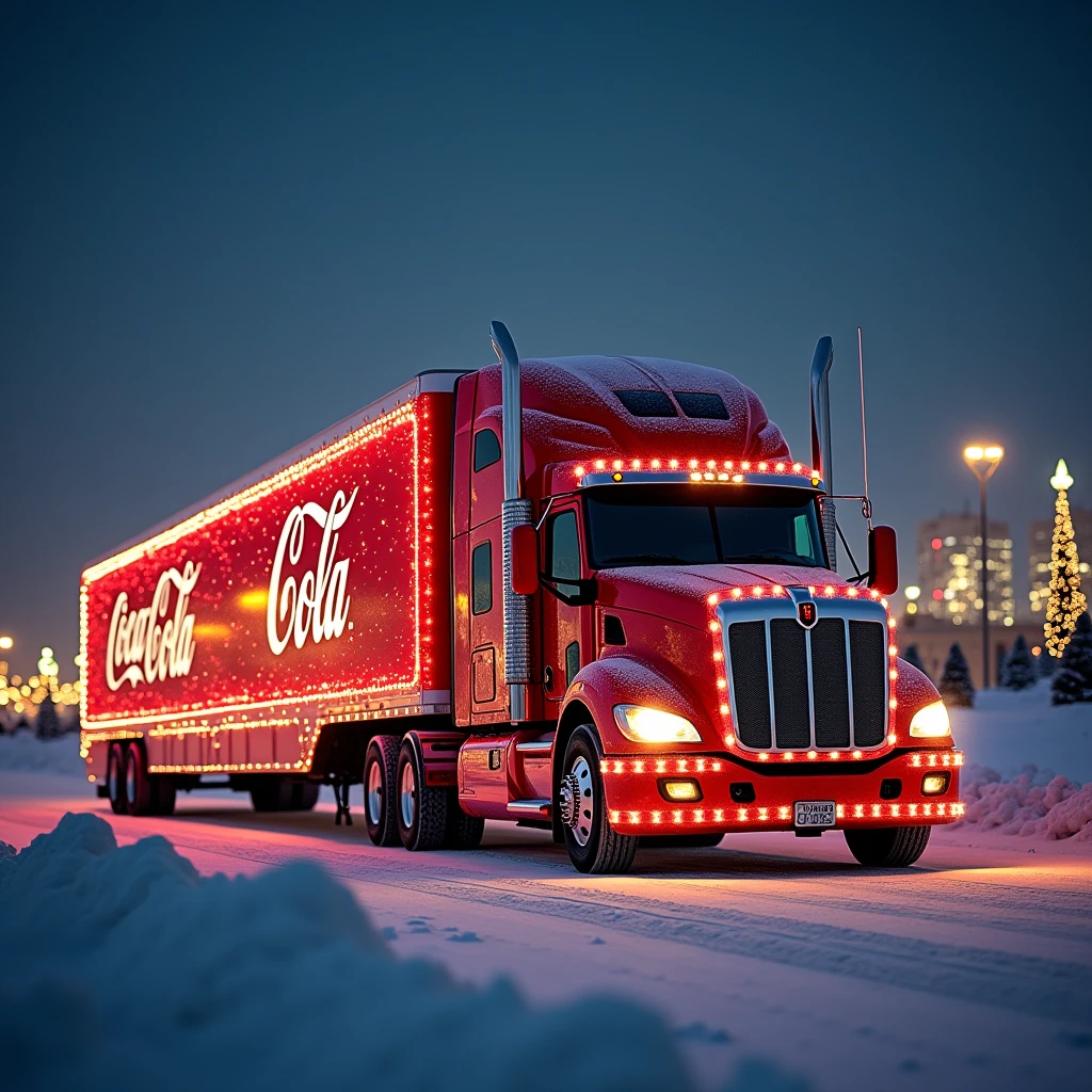 Araf truck driving down a snowy road with a coca cola sign on the side