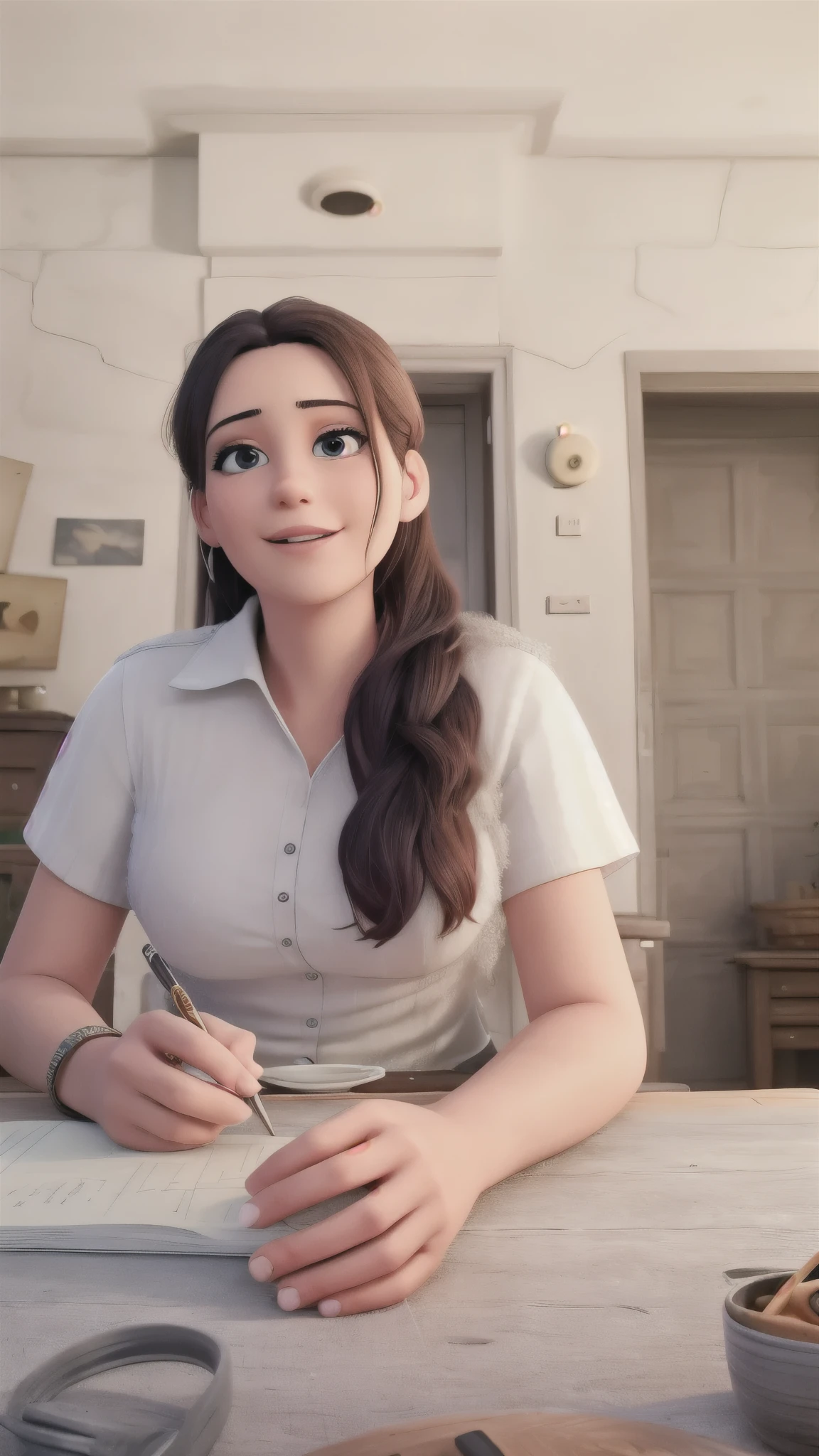 A woman sitting at a table writing in a notebook