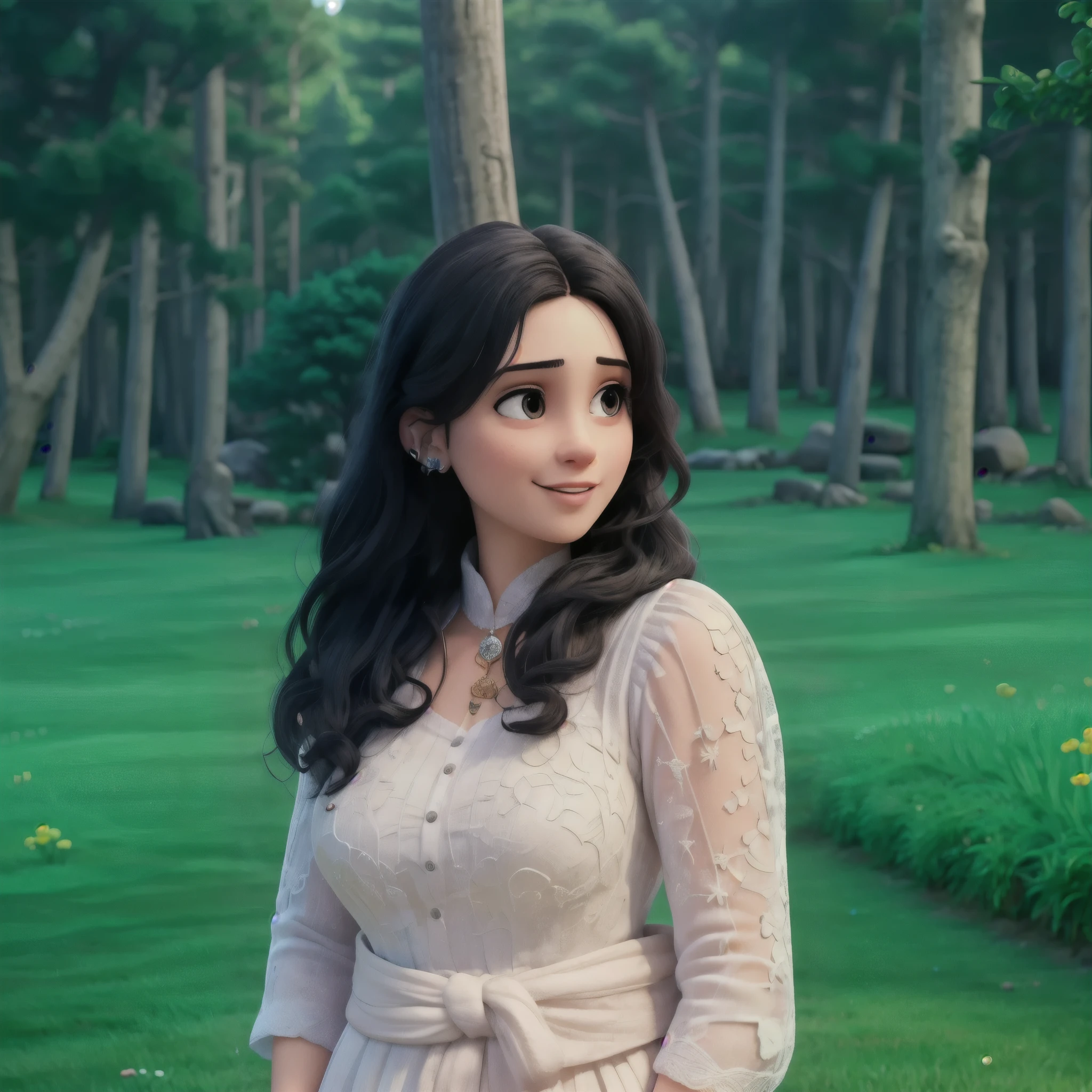 A woman in a white dress standing in a field of grass