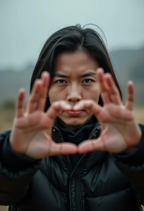 Outdoors, mist, mountains, a woman dressed in monk robes is holding a sign that