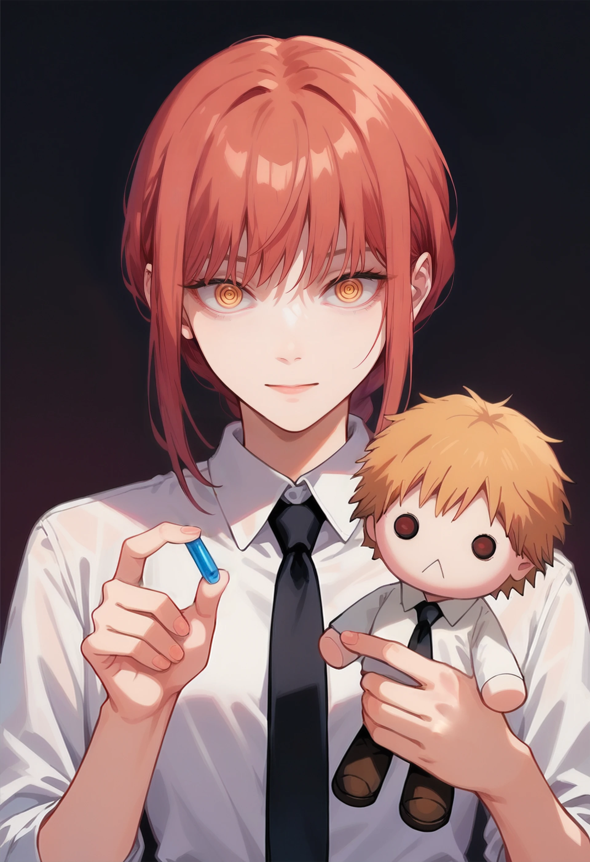 makima, red hair, braid ponytail, ringed eyes, yellow eyes, white shirt, black necktie