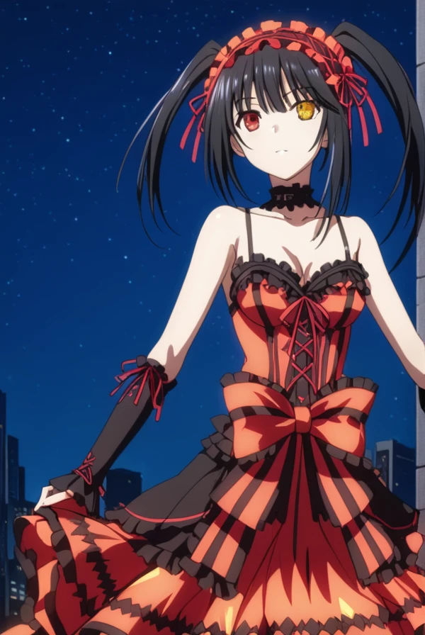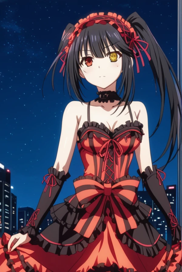 kurumi tokisaki astral dress, long hair, black hair, red eyes, twintails, yellow eyes, hairband, heterochromia, dress, red dress, ???? shoulders, collarbone, choker, bowtie, red bowtie, detached sleeves, corset, frills,