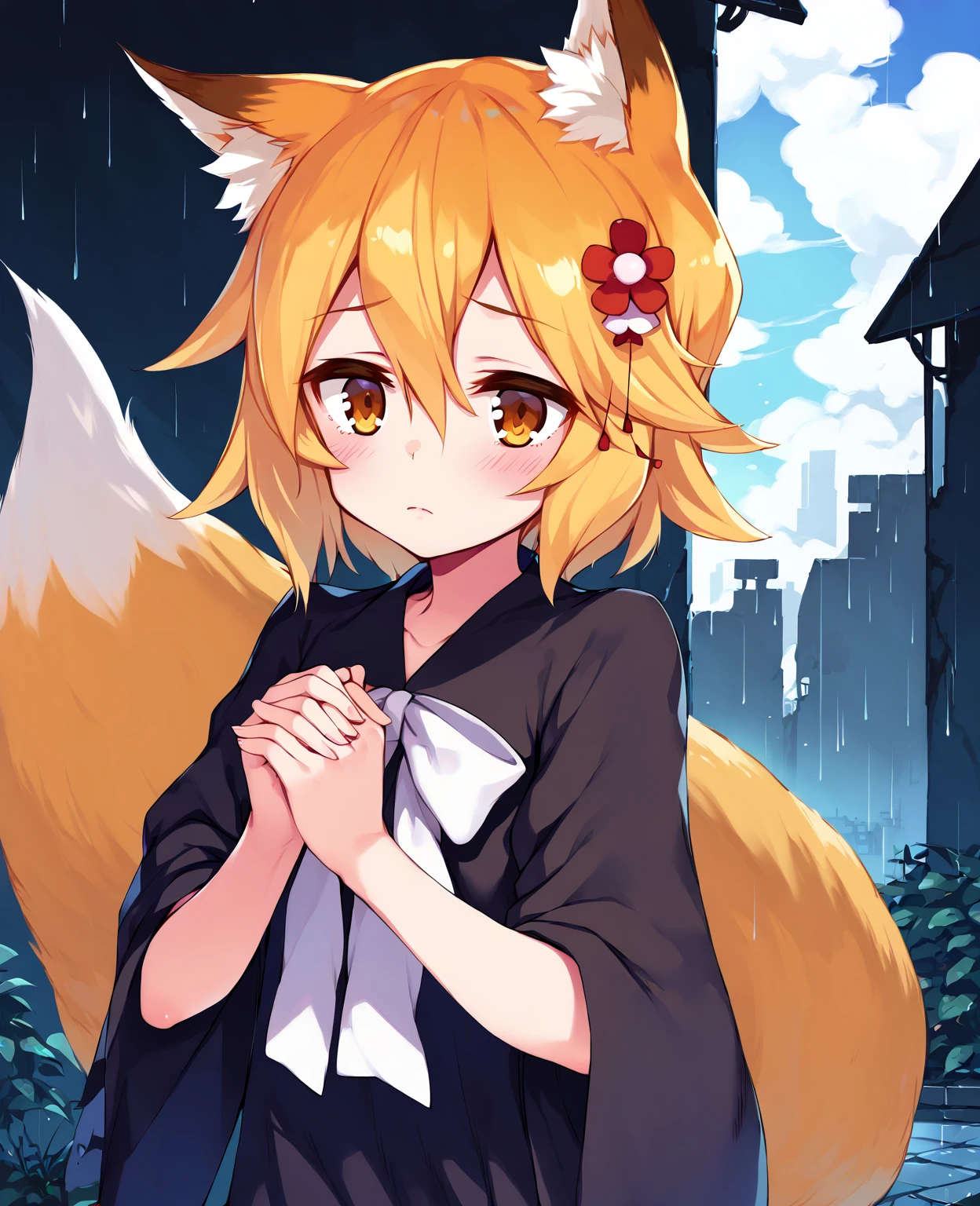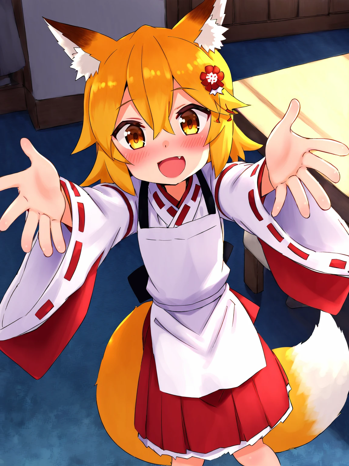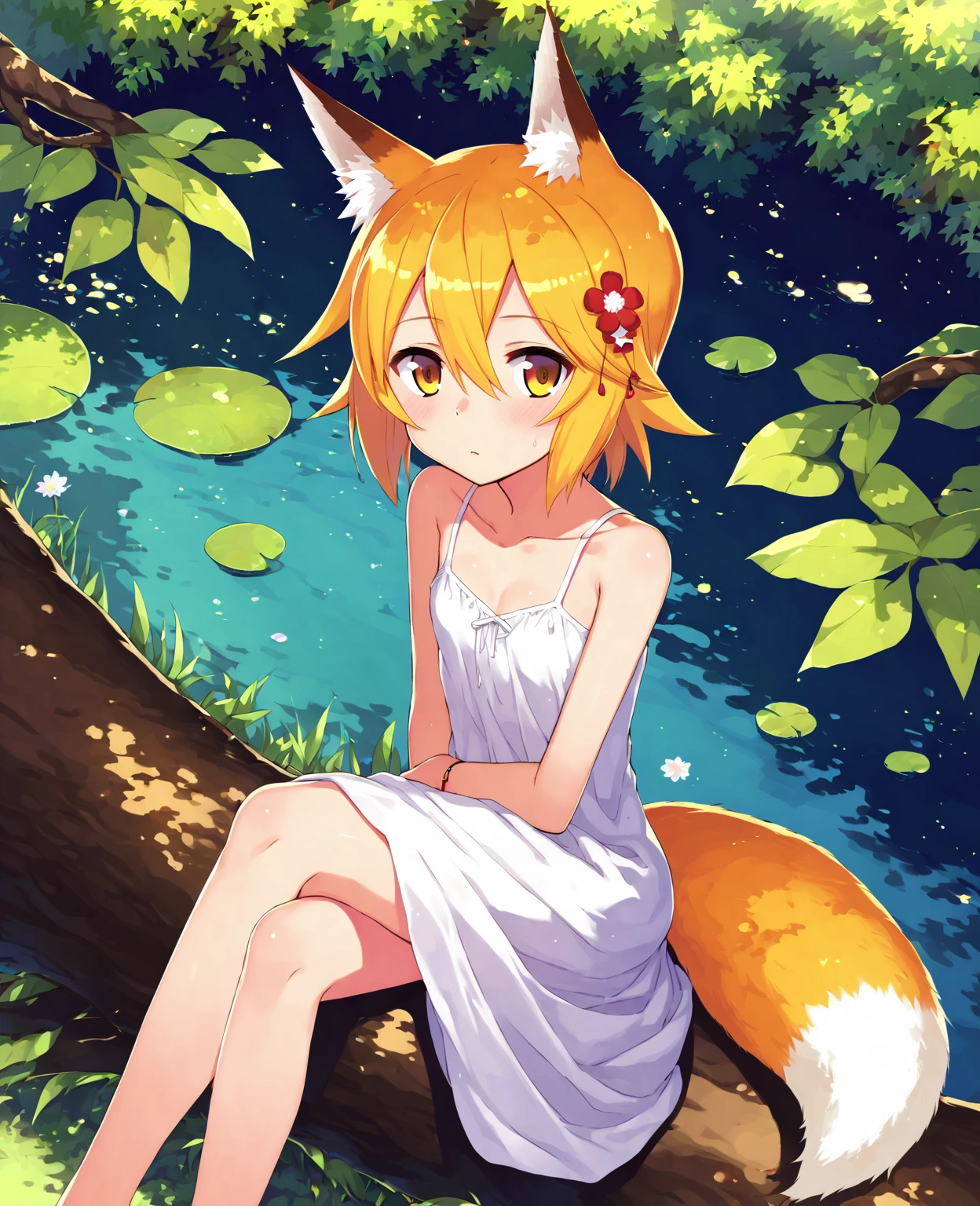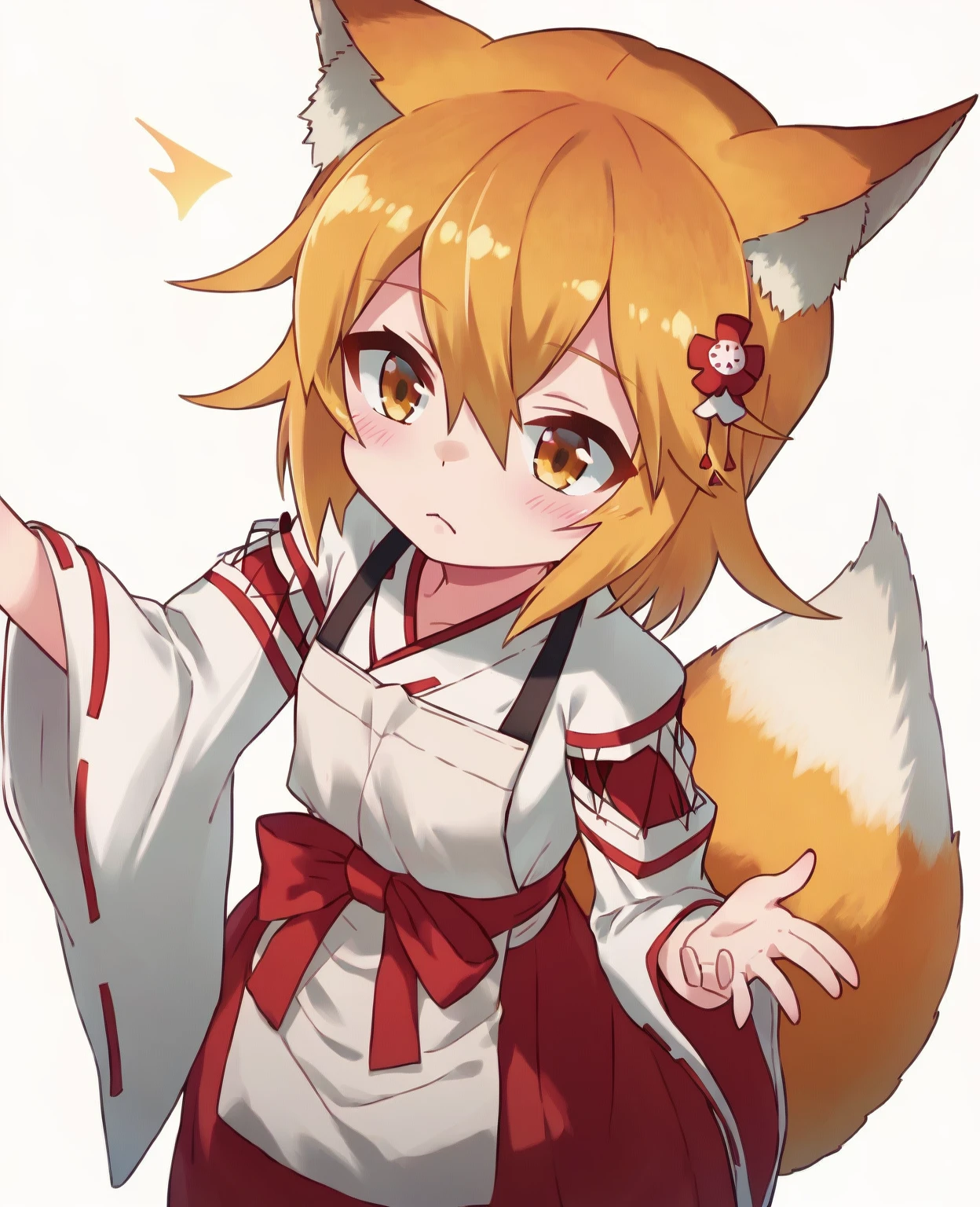 sen, blonde hair, animal ears, fox ears, blush, animal ear fluff, hair ornament, fox girl, hair flower, hair between eyes, short hair, fox tail, tail, flat chest, yellow eyes, young girl