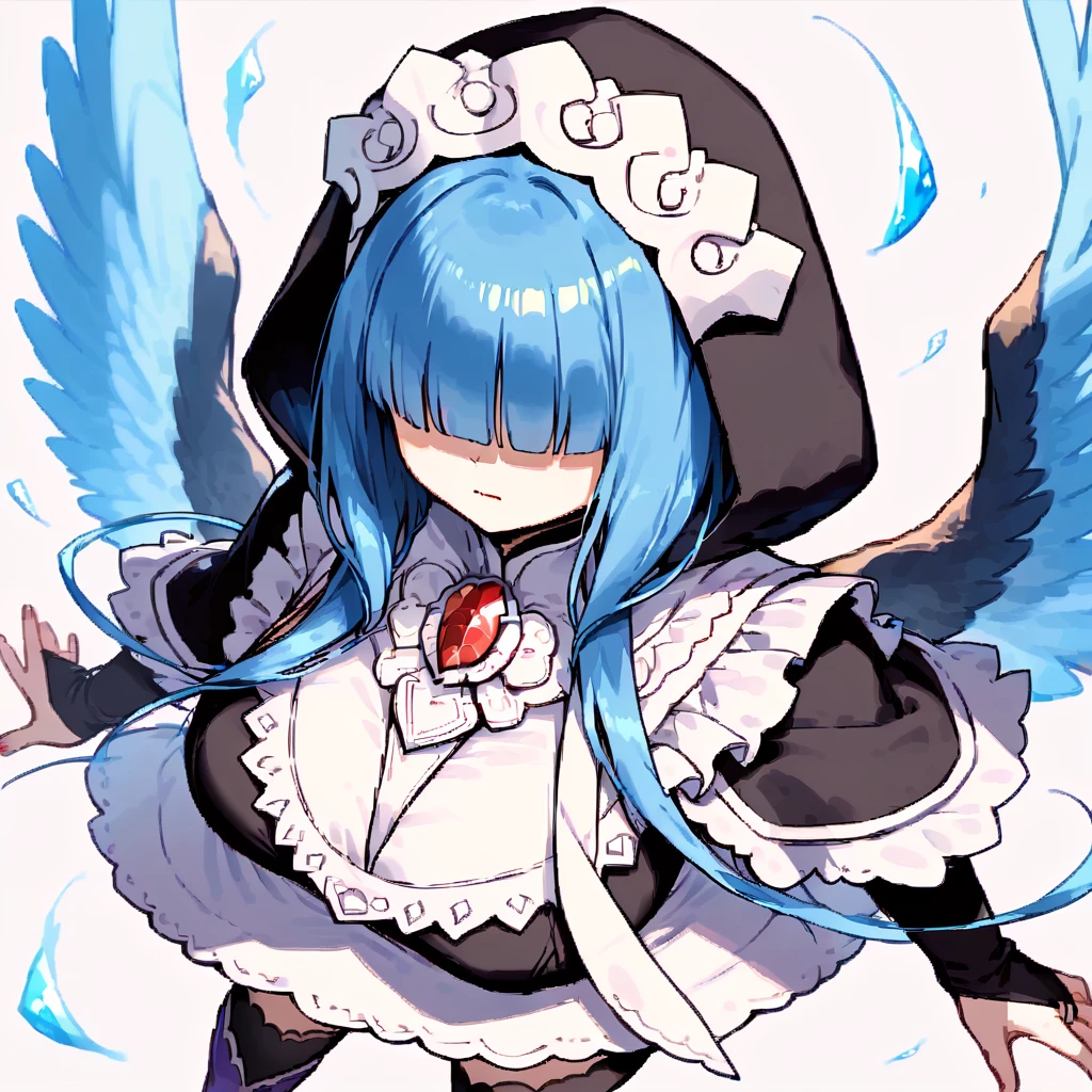 mahoko, blue hair, wings, hood, hair over eyes, hood up, capelet, gem, purple footwear, blunt bangs