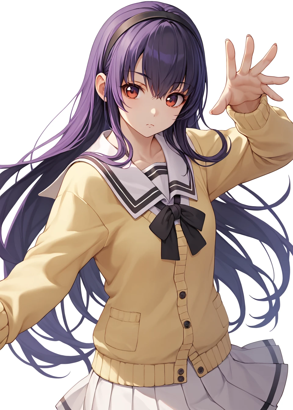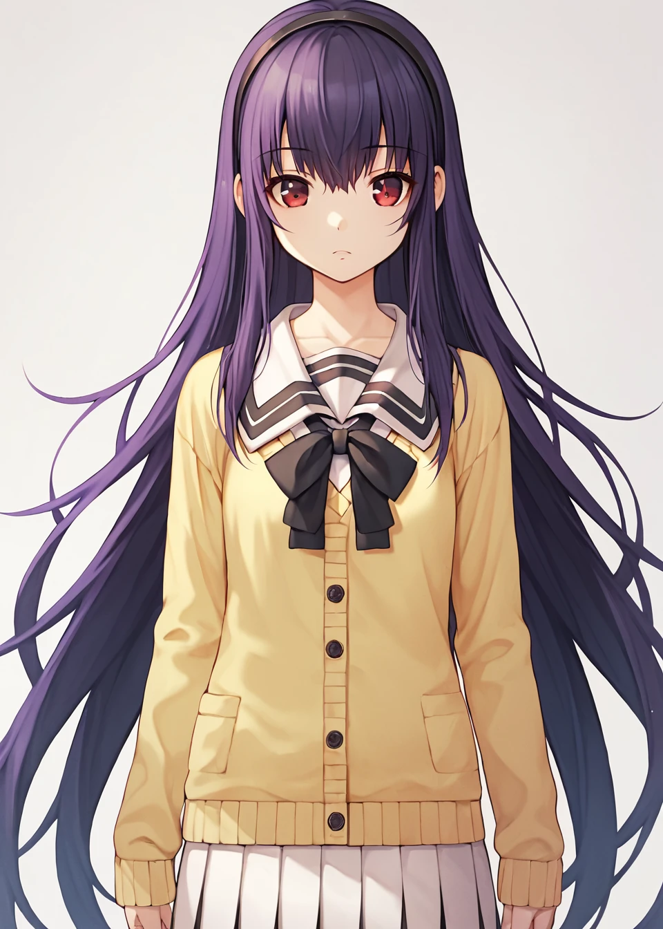 school uniform, black bow, skirt, pleated skirt, yellow sweater, sleeves past wrists, off shoulder, serafuku, cardigan, black socks, loafersMiyuki Trigger Words (Use Always)