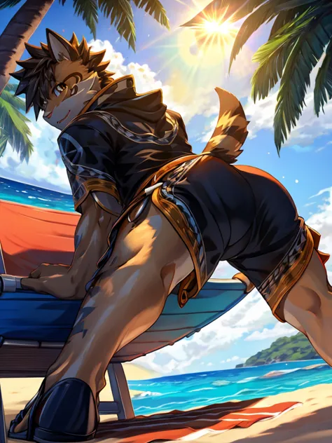 Outfit prompts: "hood, shorts, collar, fingerless gloves"