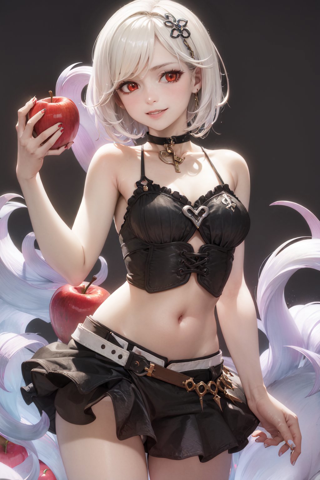 Alter Ego: djeetaego, pale skin, white hair, red eyes, crop top, sleeveless, black skirt, choker