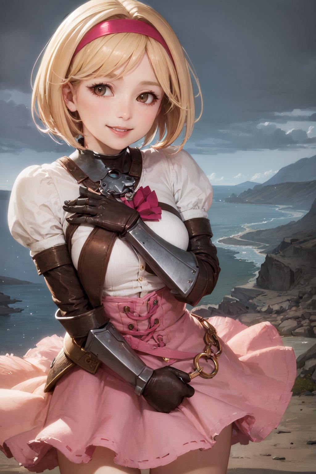 Default Outfit: djeetadef, hairband, armor, pink dress, bow, pink skirt, thigh boots, gauntlets