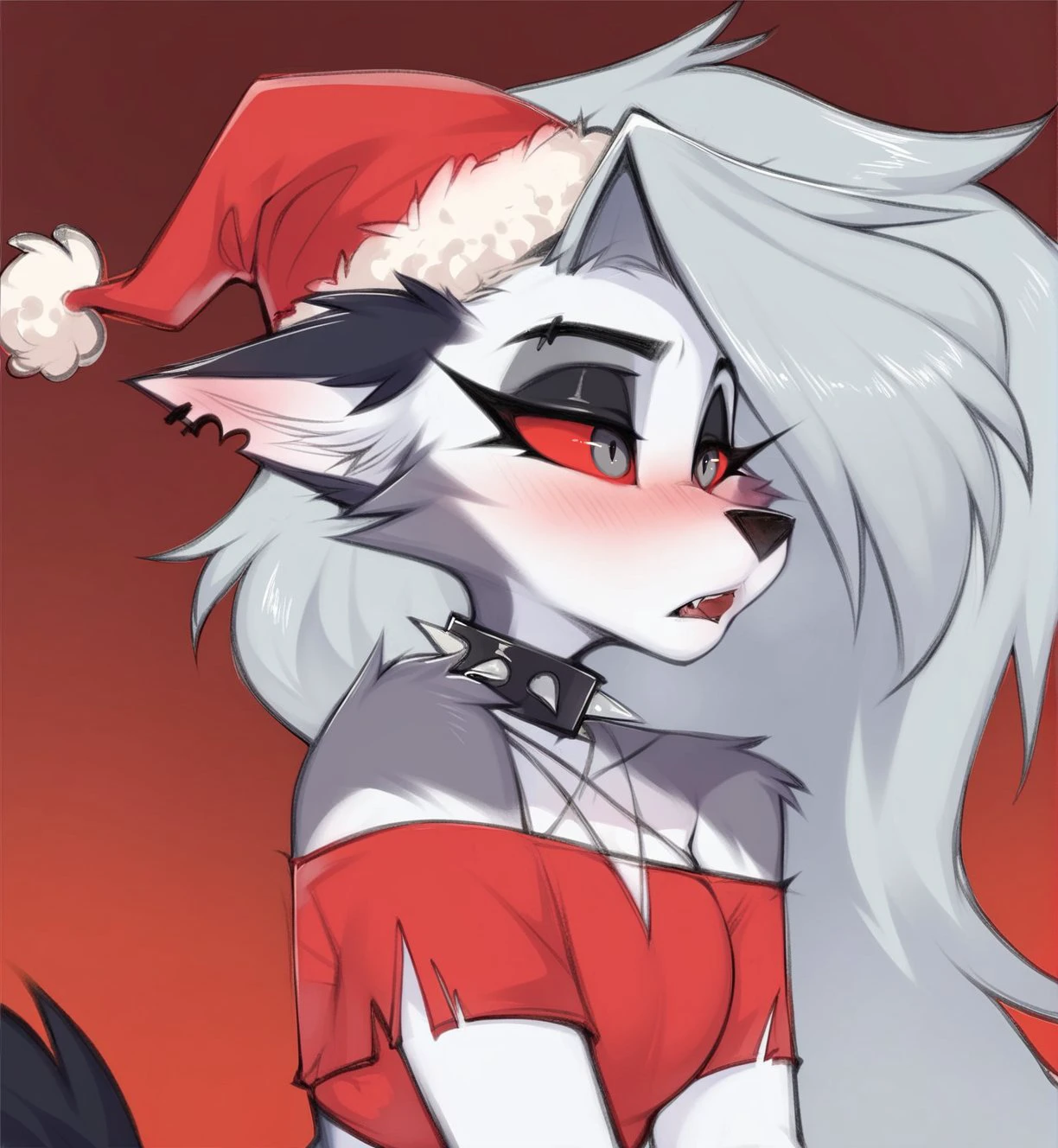 LoonaEX, 1girl, hellhound, loona helluva boss, furry, anthro, red sclera, gray eyes, silver hair, spiked collar, top