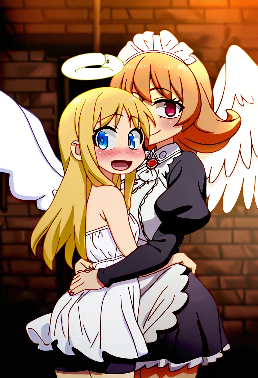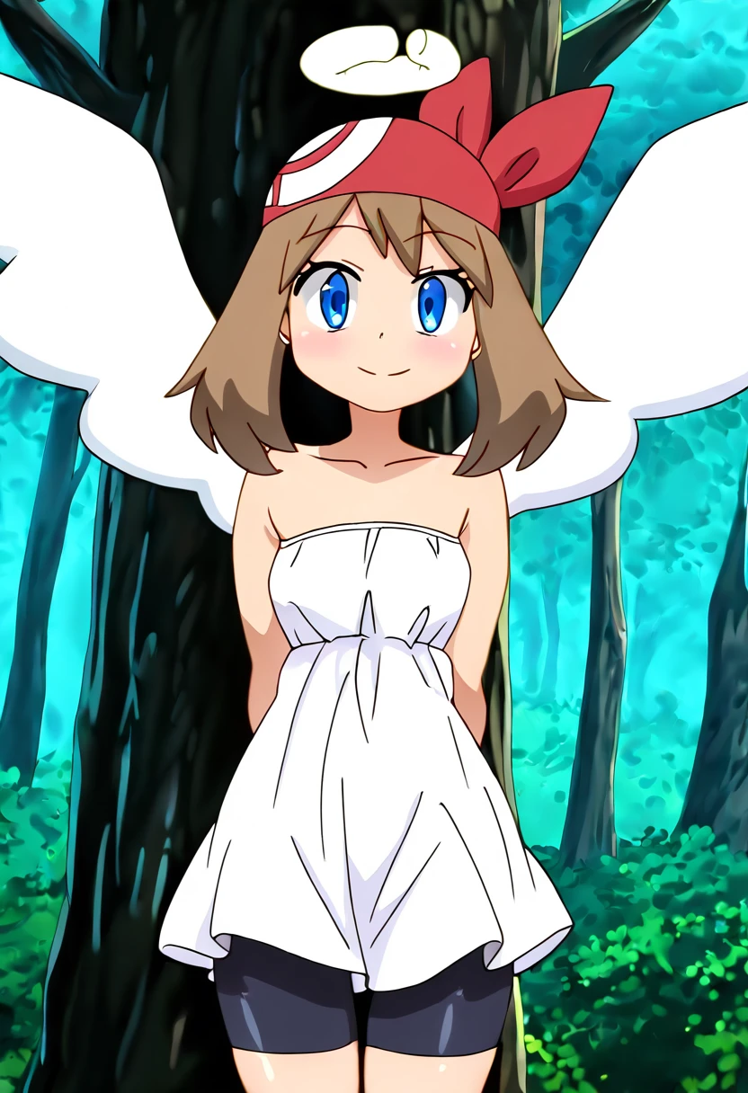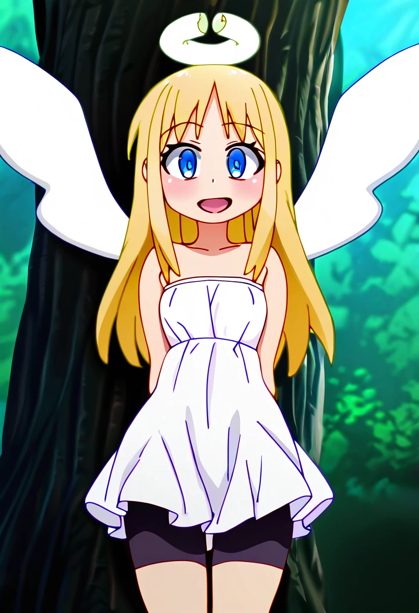 Crimvael - Crimvael, solo, long hair, open mouth, blue eyes, blonde hair, dress, ???? shoulders, wings, shorts, white dress, strapless, halo, black shorts, bike shorts, strapless dress, angel wings, angel, shorts under dress