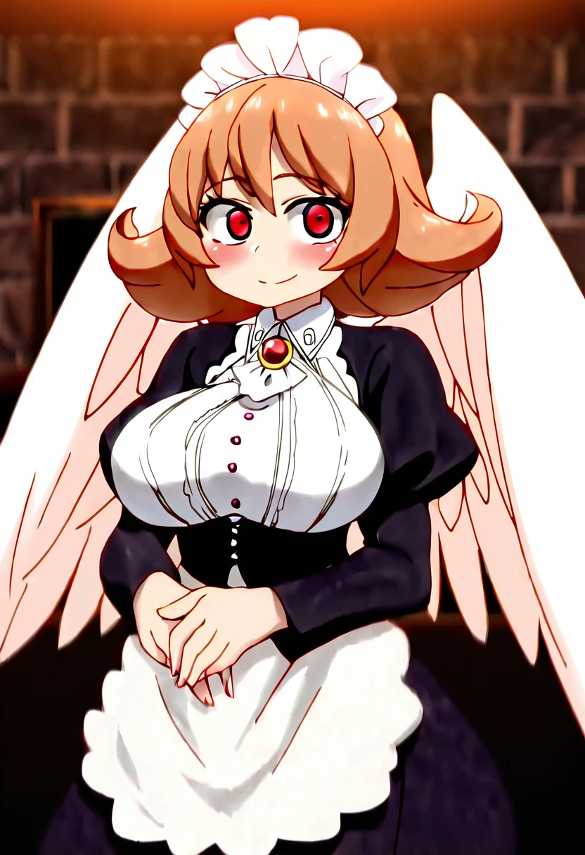 Meidri - Meidri, 1girl, bangs, ?????????????, brown hair, long sleeves, dress, frills, wings, puffy sleeves, orange hair, apron, maid, maid headdress, juliet sleeves, monster girl, feathered wings, puffy long sleeves, white wings, flipped hair, harpy,