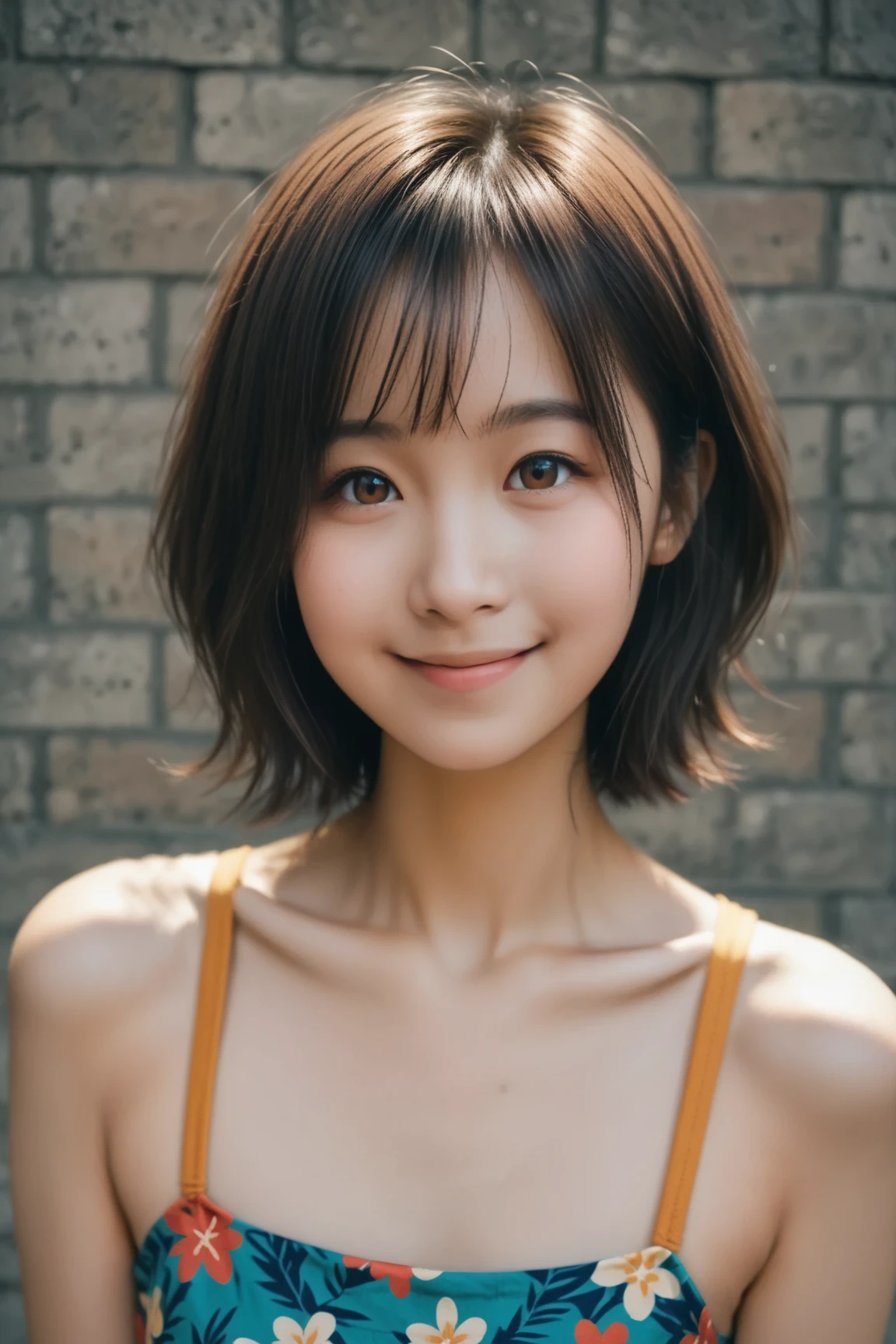 brown bob hair. natural texture messy hair. She has tan lines.