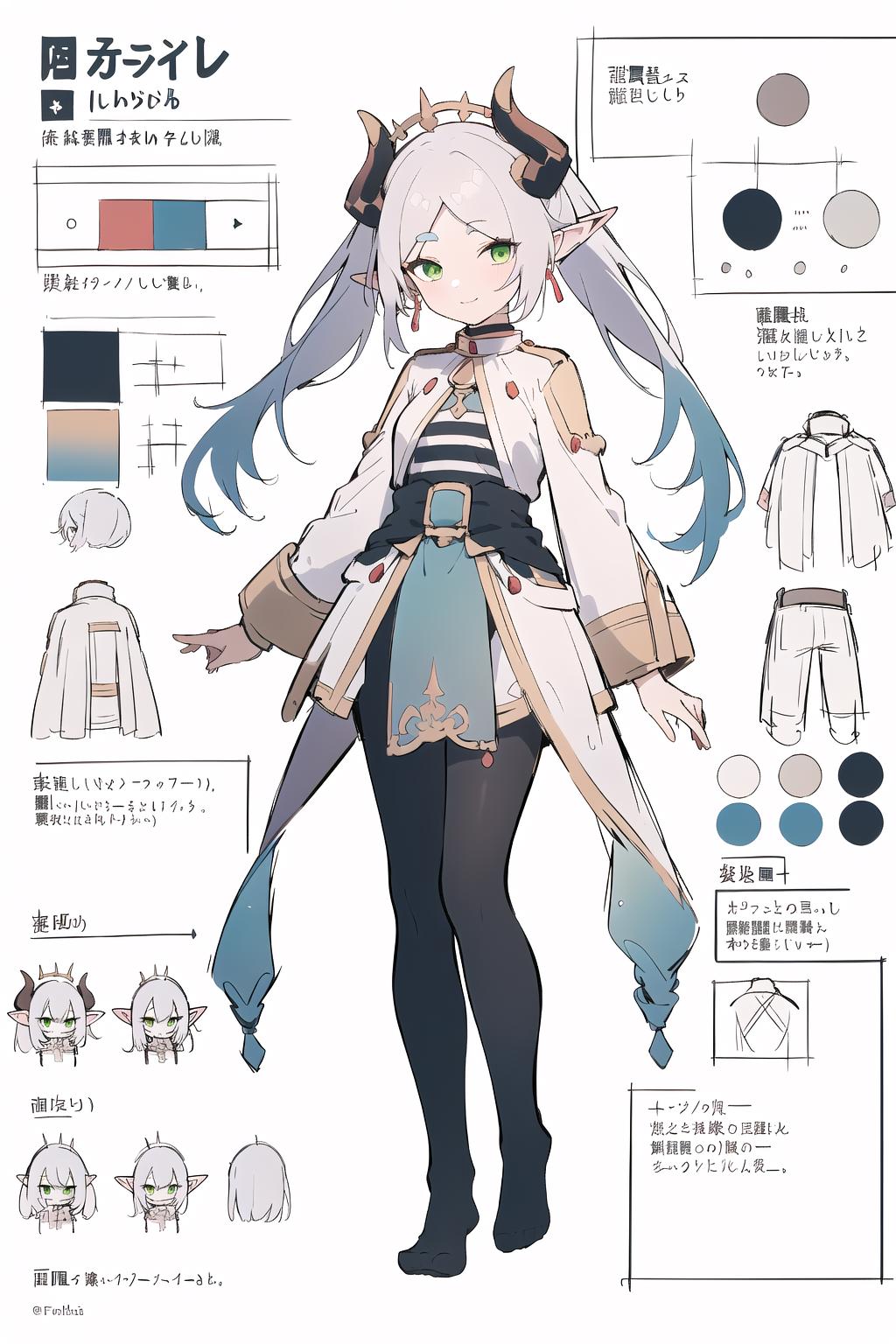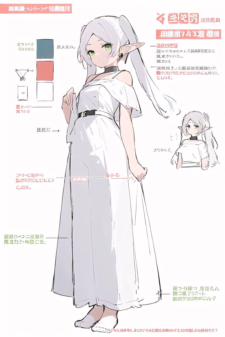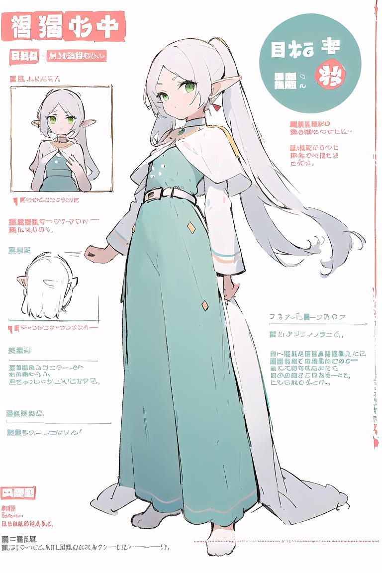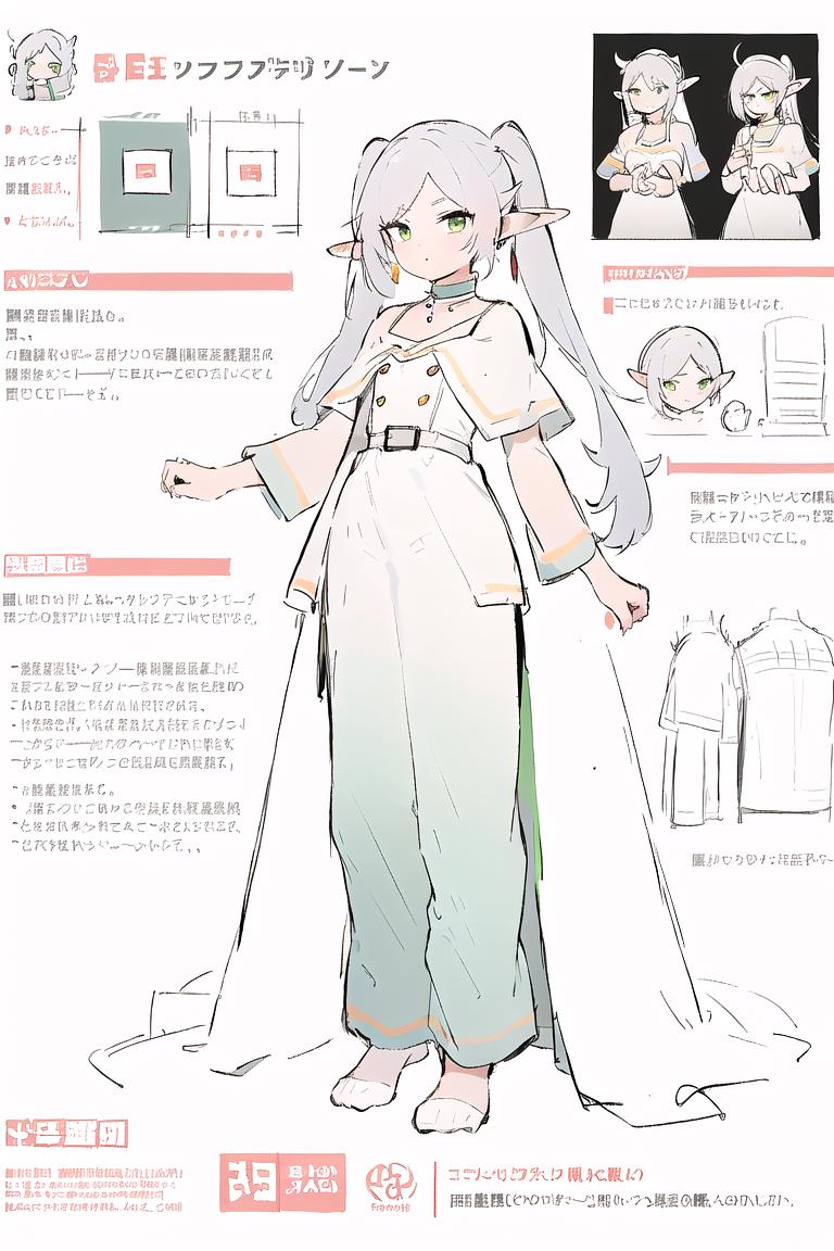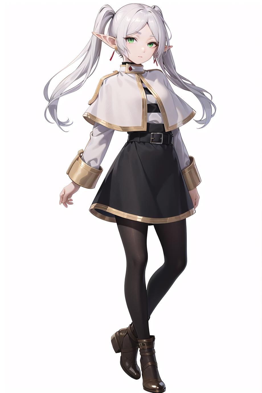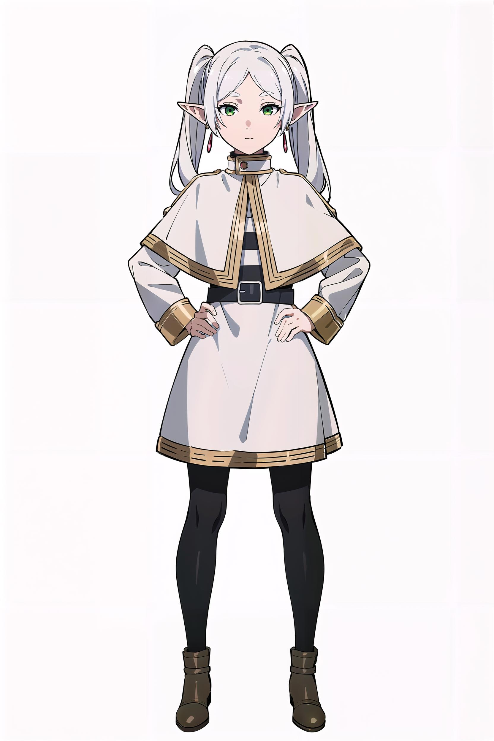 芙莉莲:fll, twintails, 1girl, pointy ears, round face,white hair, green eyes, elf, pantyhose, long hair, earrings, black pantyhose, white capelet, long sleeves, dress,