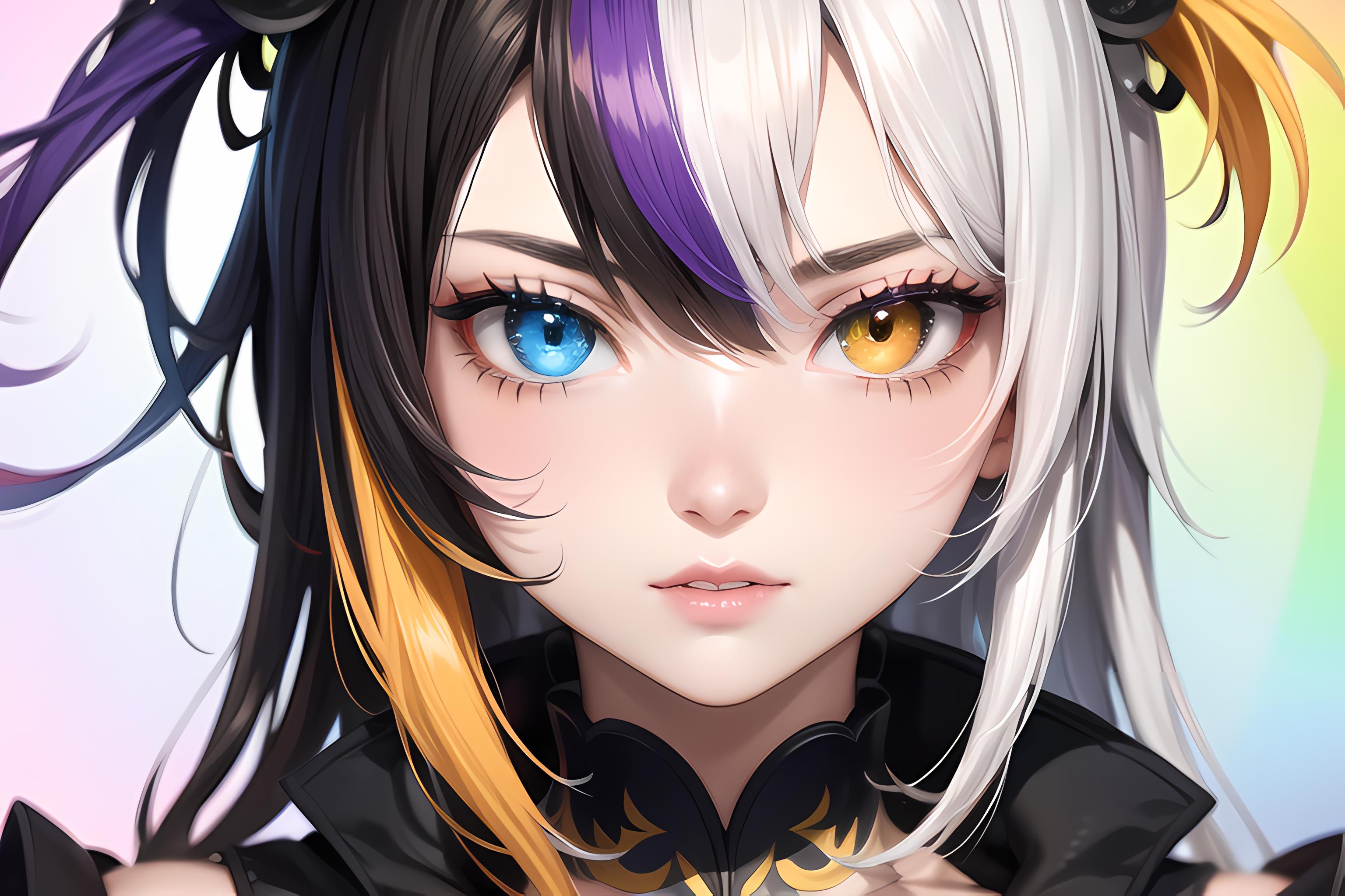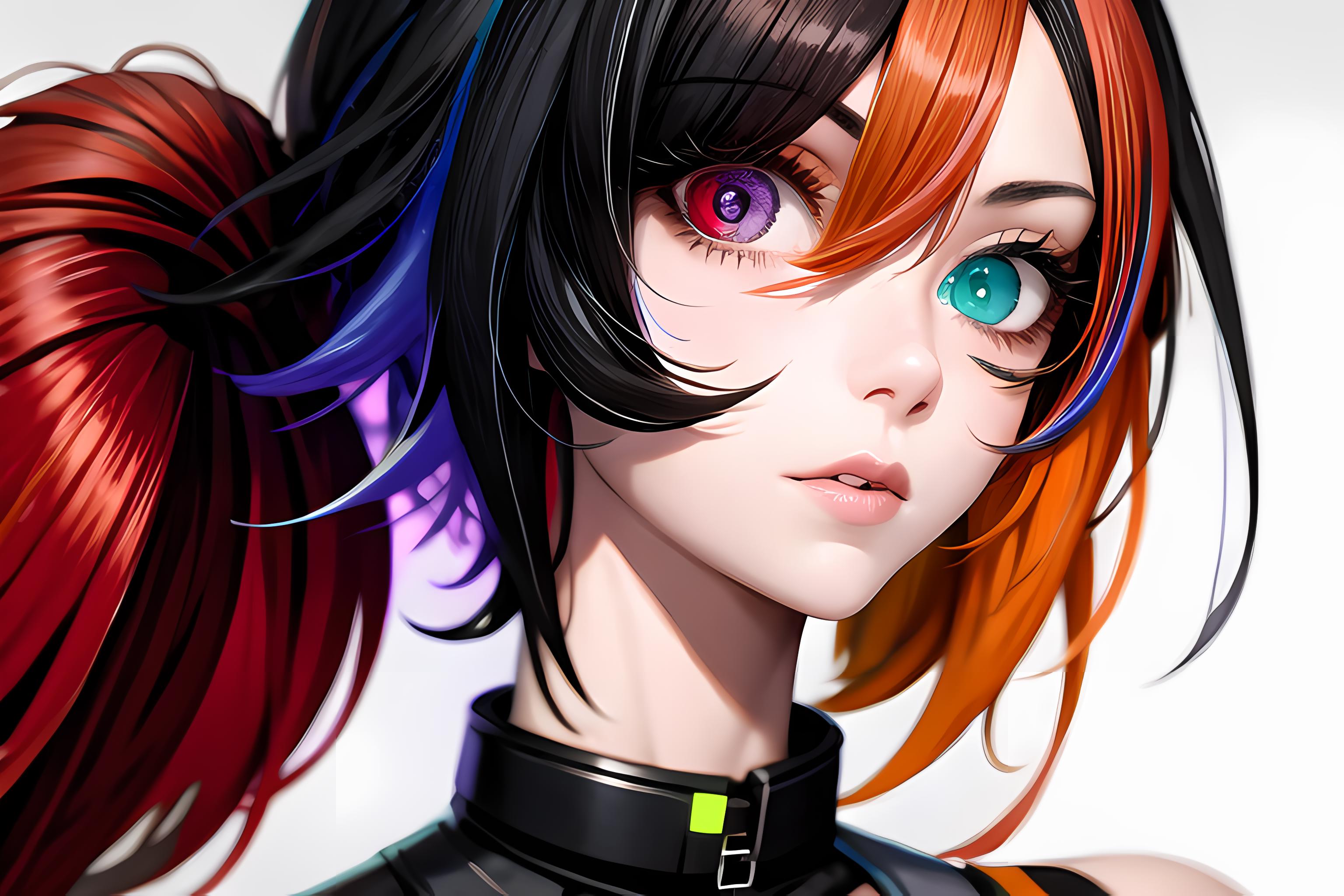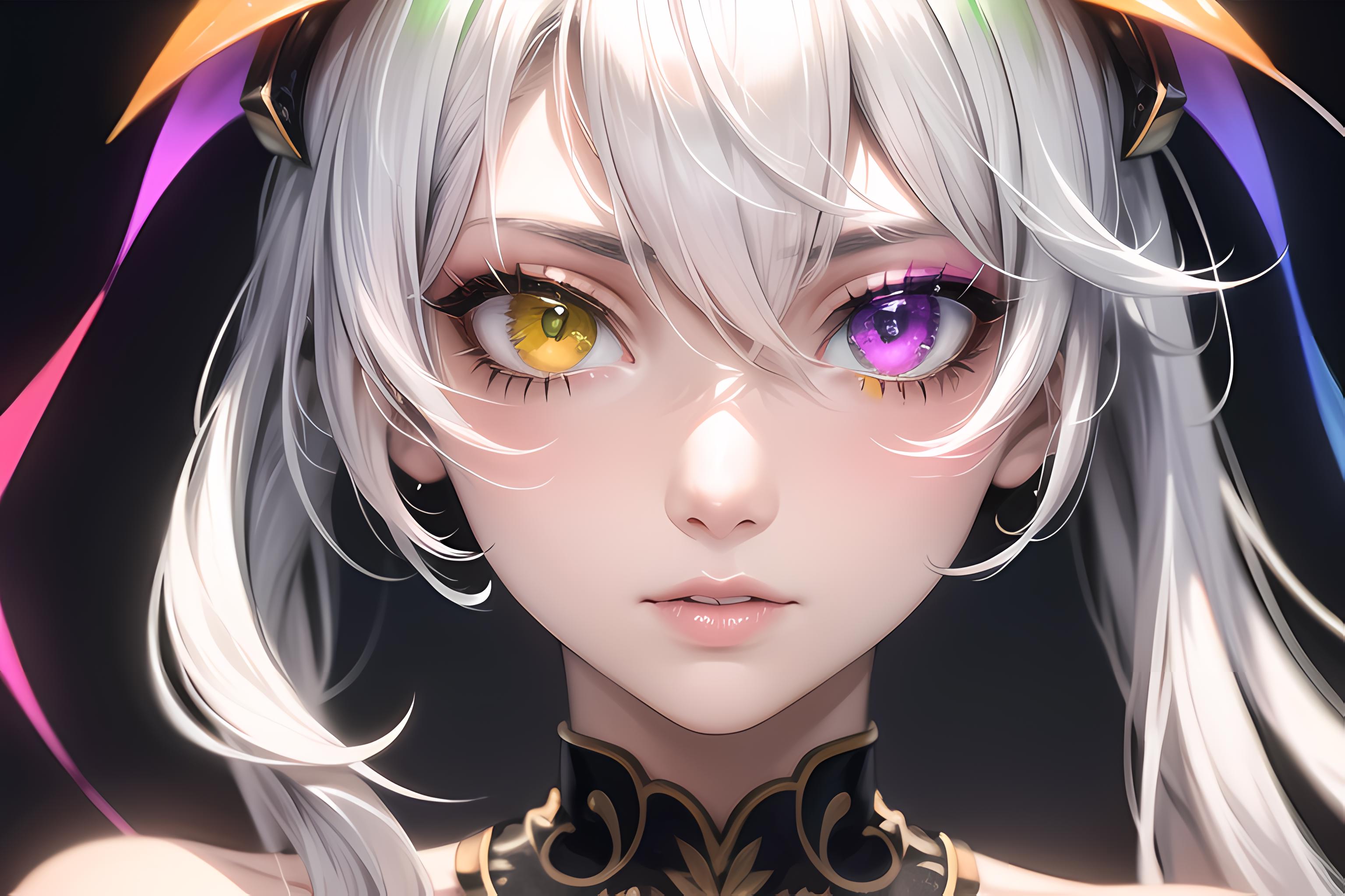 A Fun side effect of me adding more colors to the mix was a nifty rainbow eye. I have yet to reproduce it by prompt, however you might get lucky. Occasionally produces reflections and artefacts within the iris, comes off looking a bit reflective