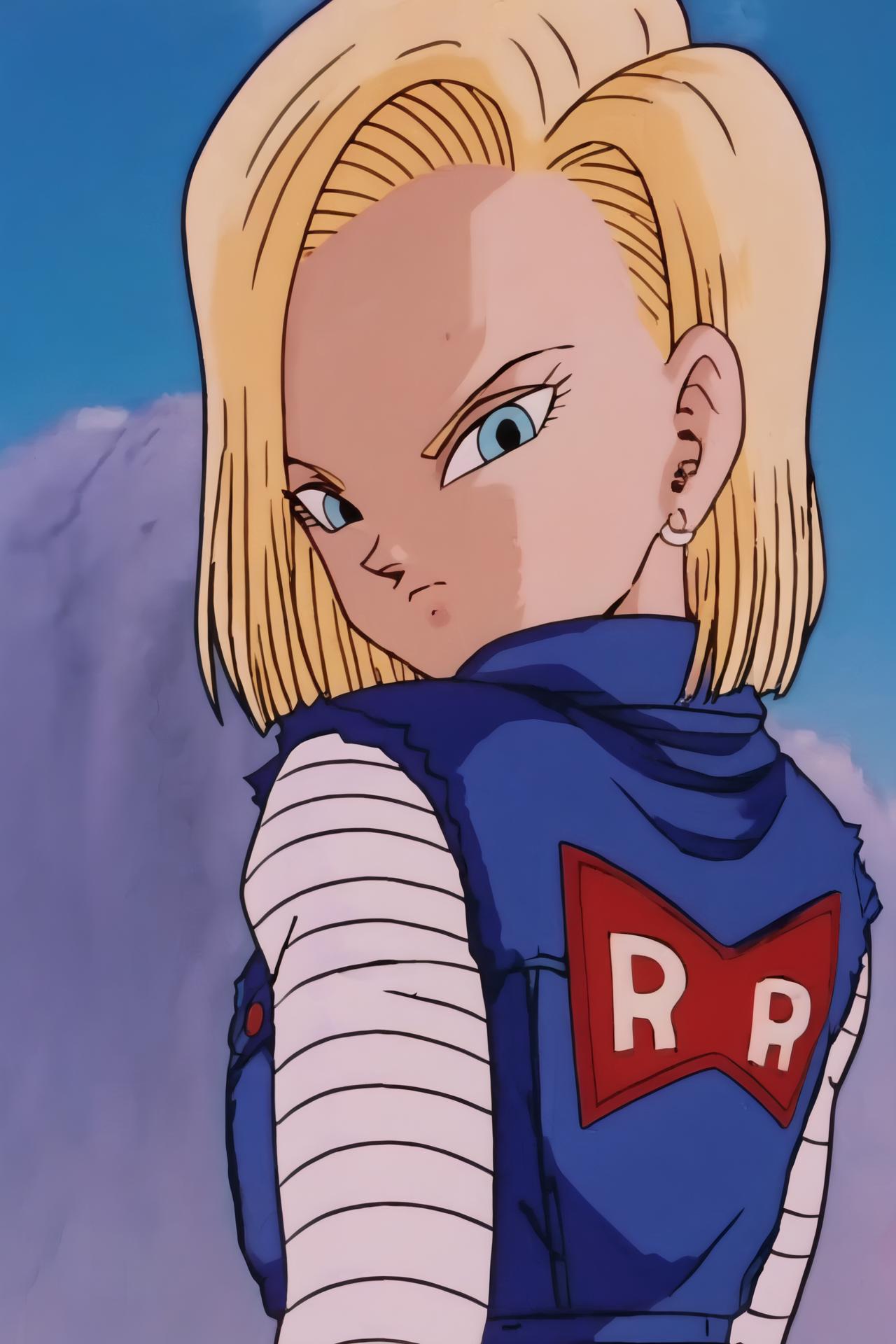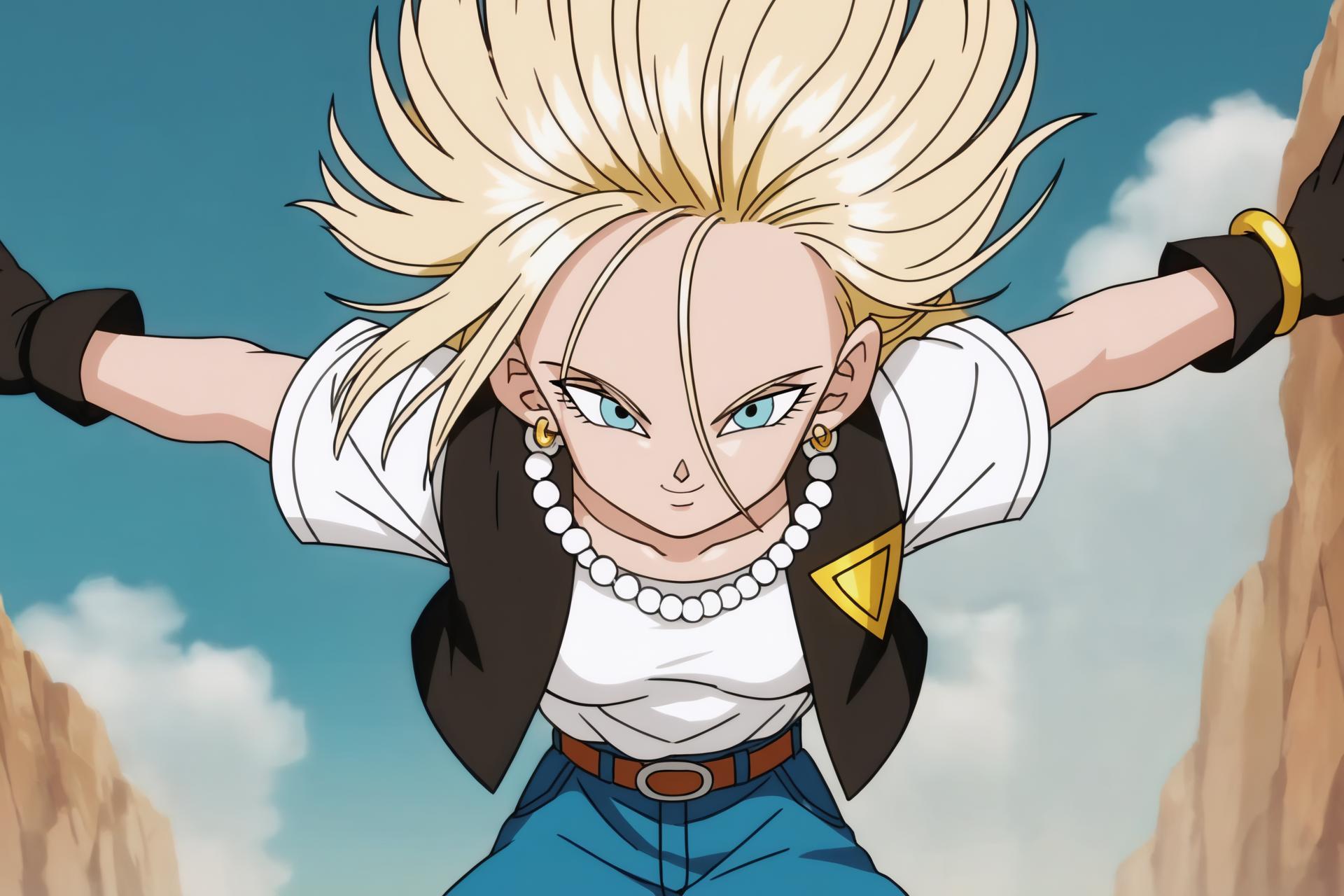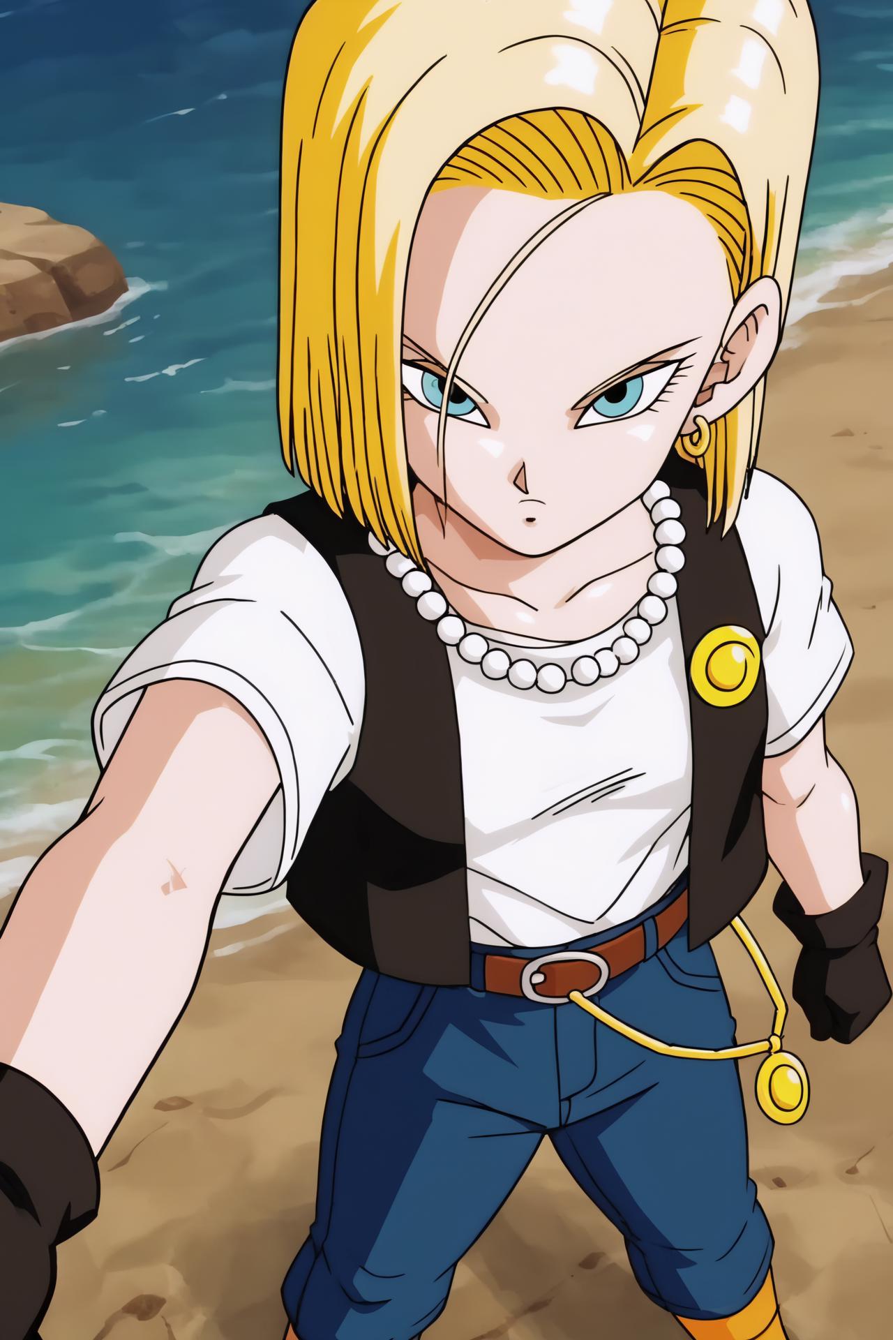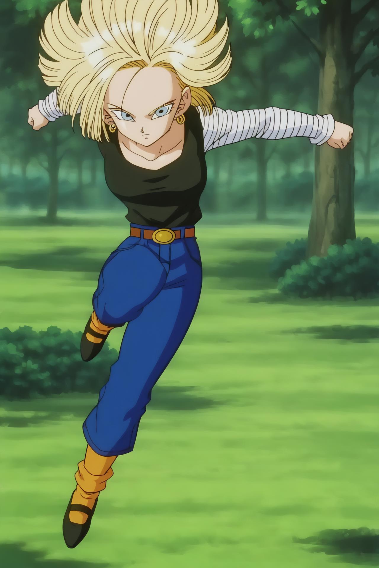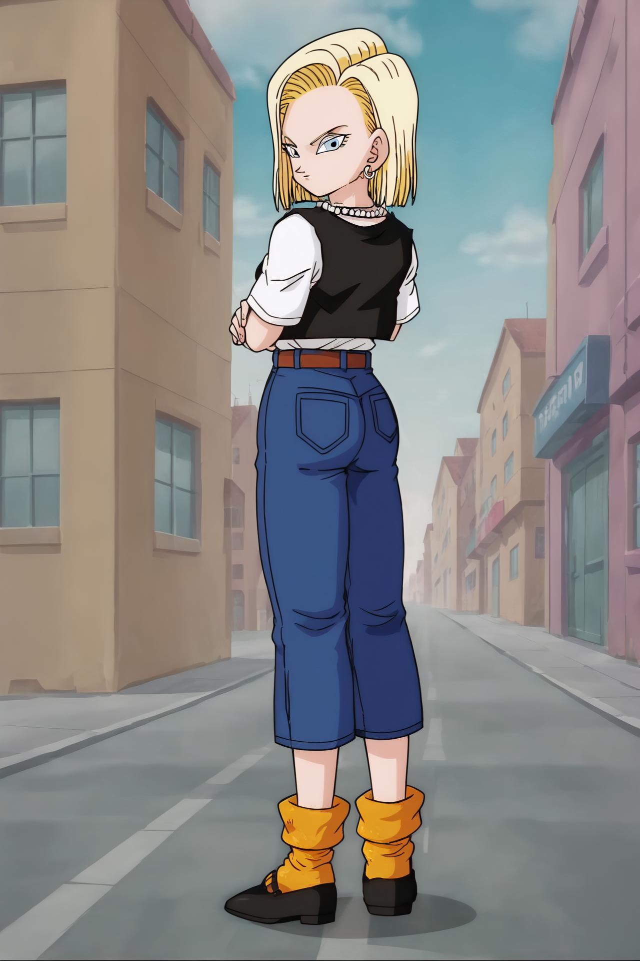 Buu Saga - earrings, shirt, long sleeves, shoes, orange socks, striped, belt, pants, black shirt, denim, jeans, high-waist pants, android 18, cell saga