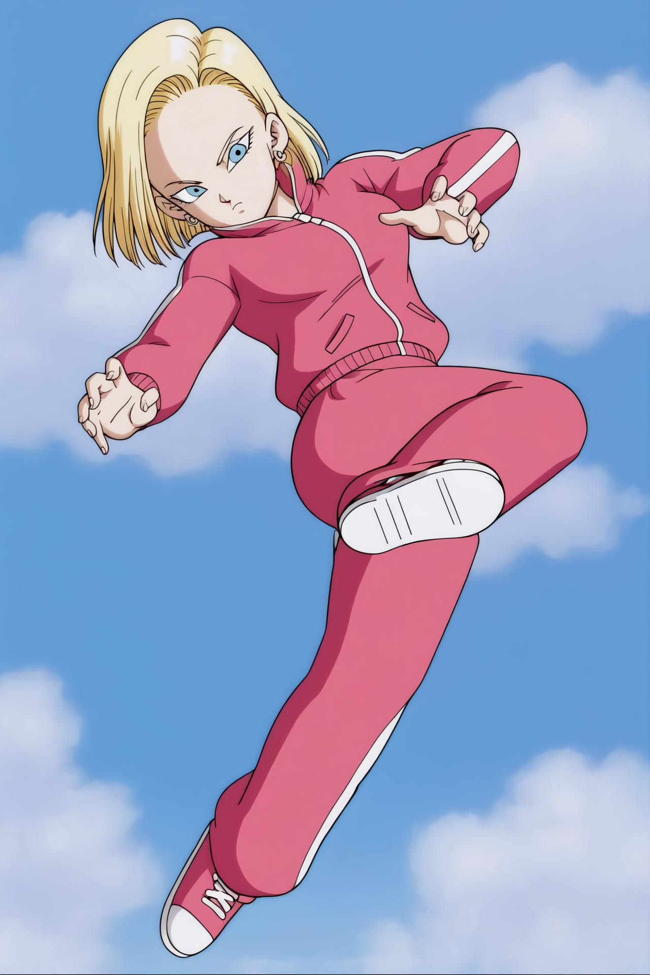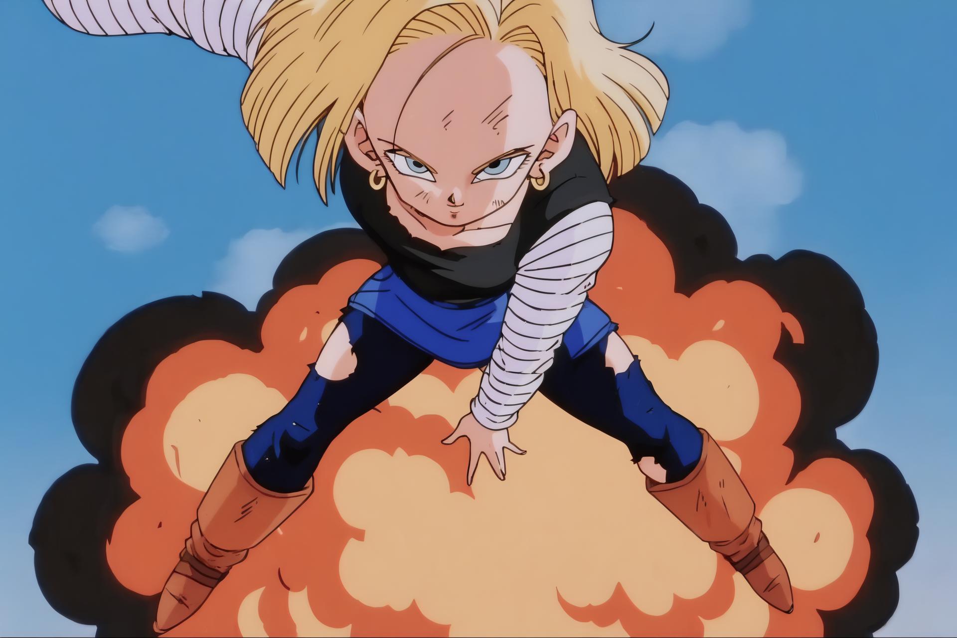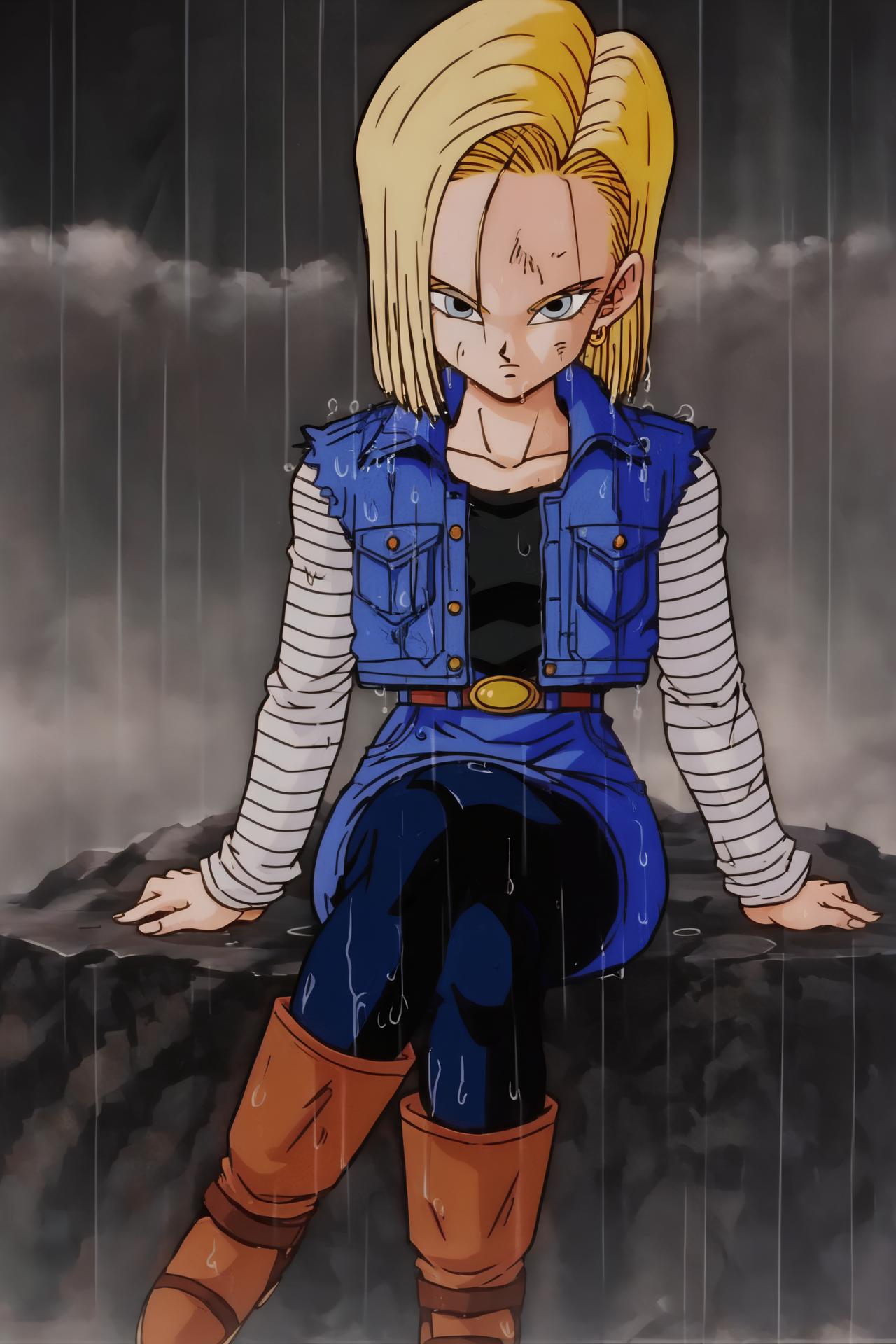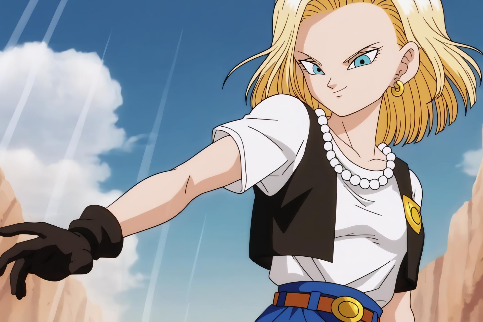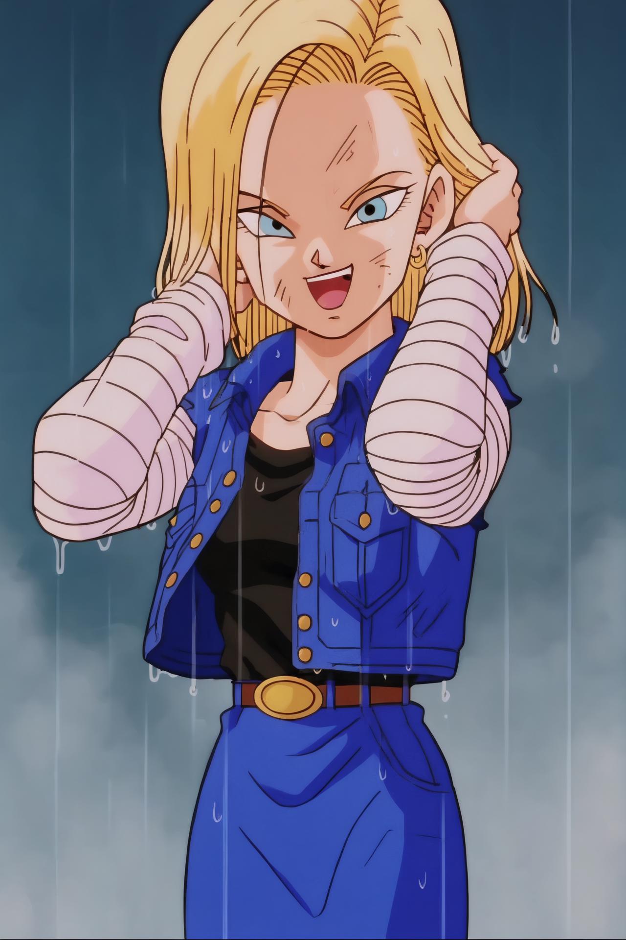 Buu Saga - earrings, shirt, long sleeves, shoes, orange socks, striped, belt, pants, black shirt, denim, jeans, high-waist pants, android 18, cell saga