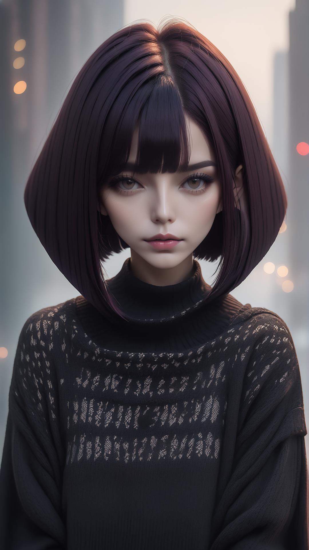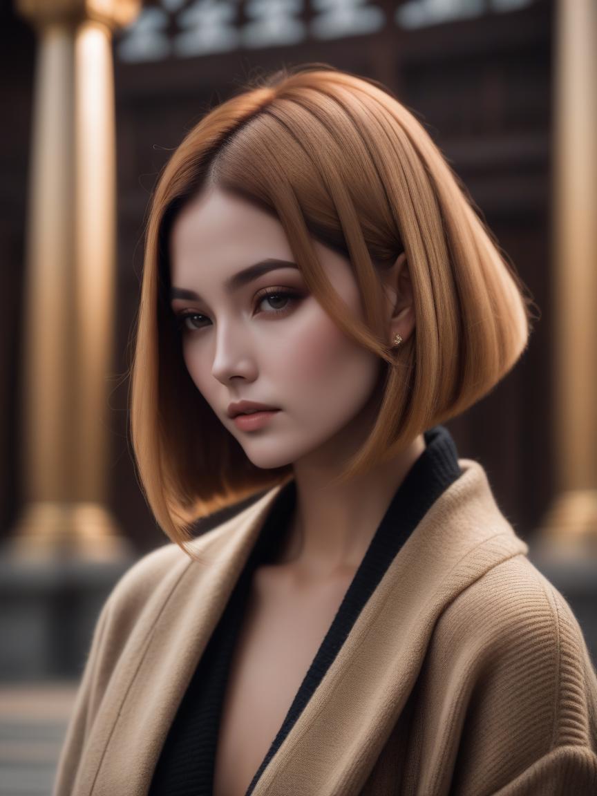 A model for producing variations of the bob hairstyle with blunted bangs and a very sharp cut around the shoulders.