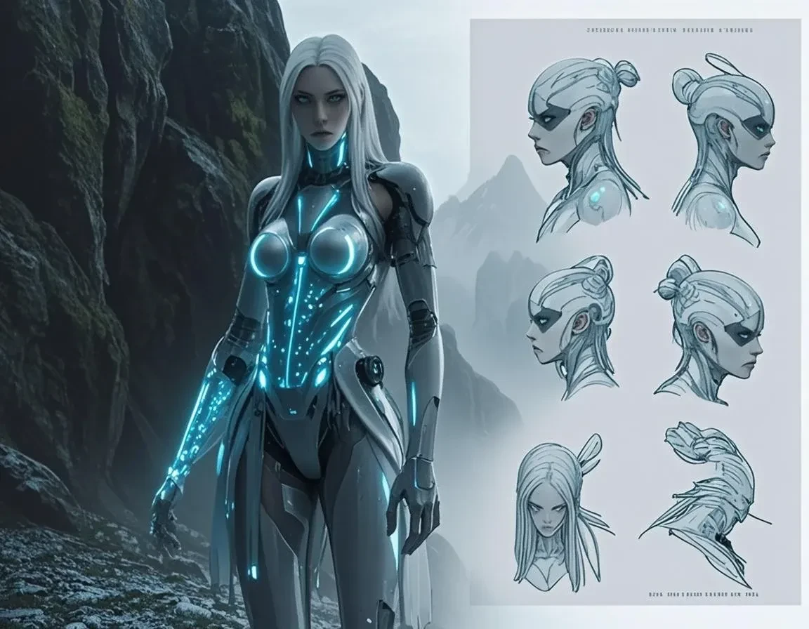 masterfully fuses human identity with technology, resulting in an otherworldly and captivating portrait. The subject, a futuristic warrior woman, emerges from the shadows with glowing electronic components adorning her body, casting an ethereal, otherworldly glow.
