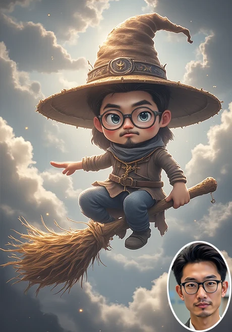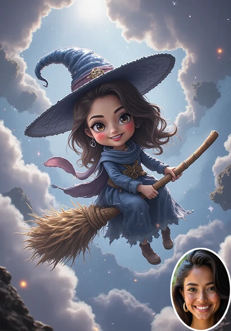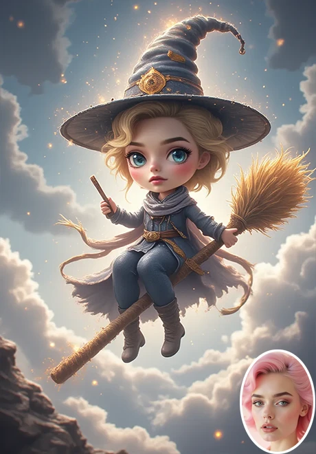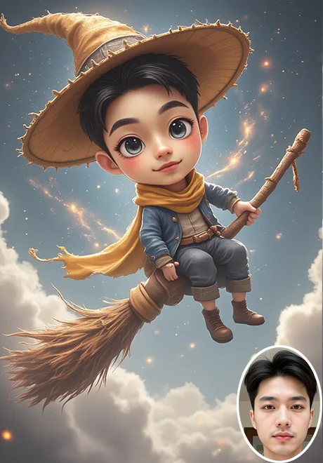 Upload a clear portrait and click Create,You will get a cartoon-style picture of a little wizard riding a broomstick. If you want a video version, you can visit my homepage or click the link below: