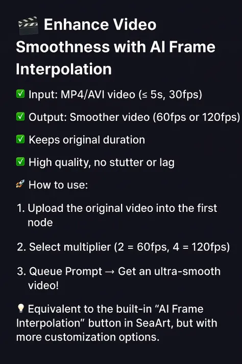 💡 Equivalent to the built-in "AI Frame Interpolation" button in SeaArt, but with more customization options.