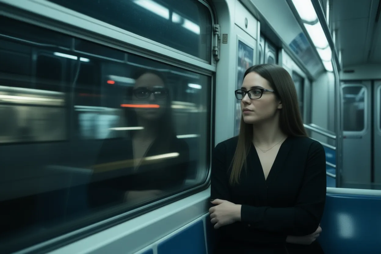 Subway Solitude captures a cinematic night ride, focusing on you as the central figure. Your reflection in the window, punctuated by city lights and cool fluorescent glow, tells a quiet, introspective story.