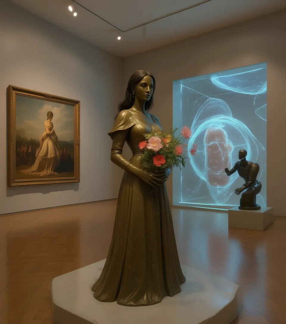 User becomes a sculpture, oil painting, marble bust, holographic museum installation — without losing identity.